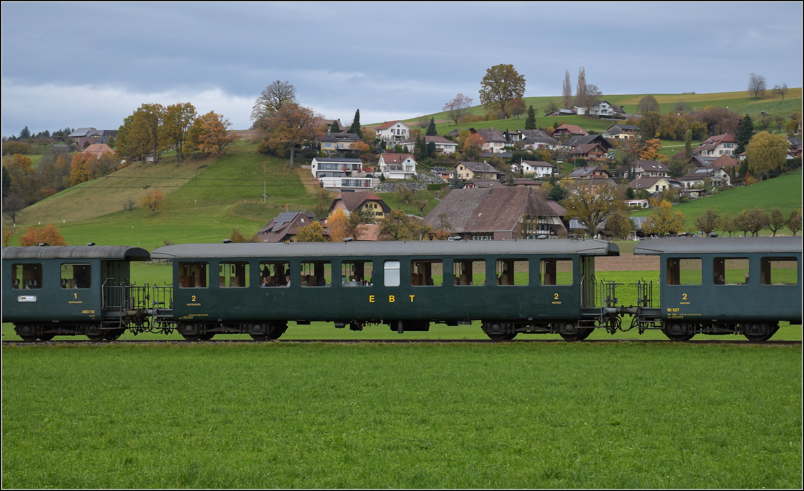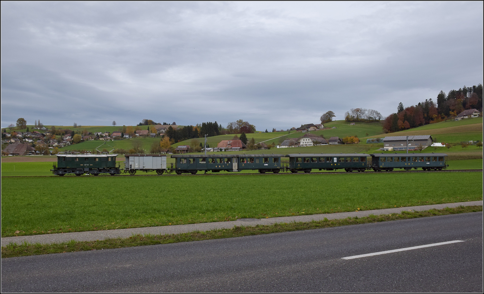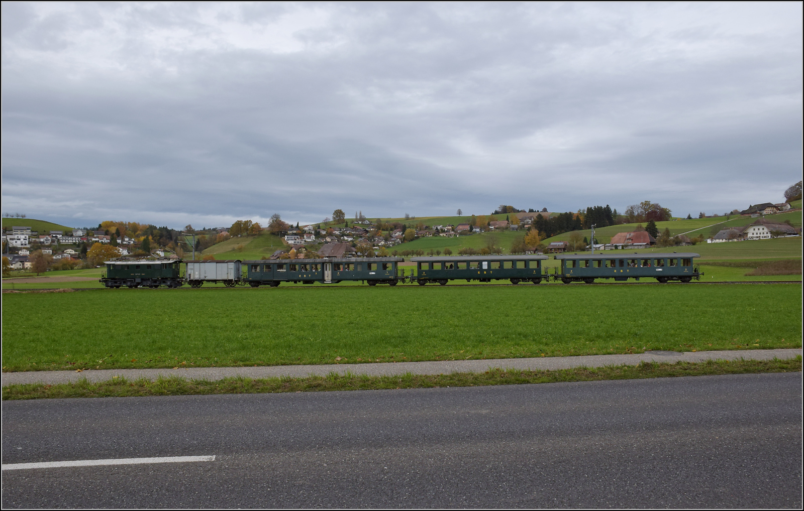 Hier kommt der Museumszug über die Präsentationswiese gefahren, im Bild der Leichtstahlwagen Bi 538. Rohrbach, November 2025. km0