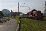 Bm 6/6 18505 ist heute in Diensten der OeBB und durfte mit den hauseigenen Salonwagen auch einen Ausflug an die Huttwiler Dampftage machen. Zunächst heisst es aber die Kreuzung mit der verspäteten SMB Ed 3/4 2 abzuwarten. Affoltern-Weier, Oktober 2024.