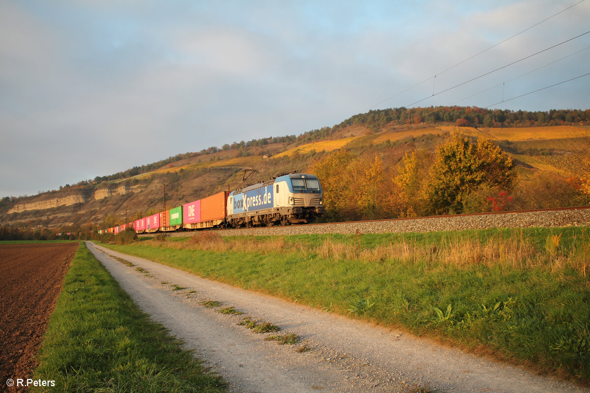 193 539 zieht im herrlichen Herbst-Abendlicht ein Containerzug bei Thüngersheim in Richtung Süden. 27.10.24