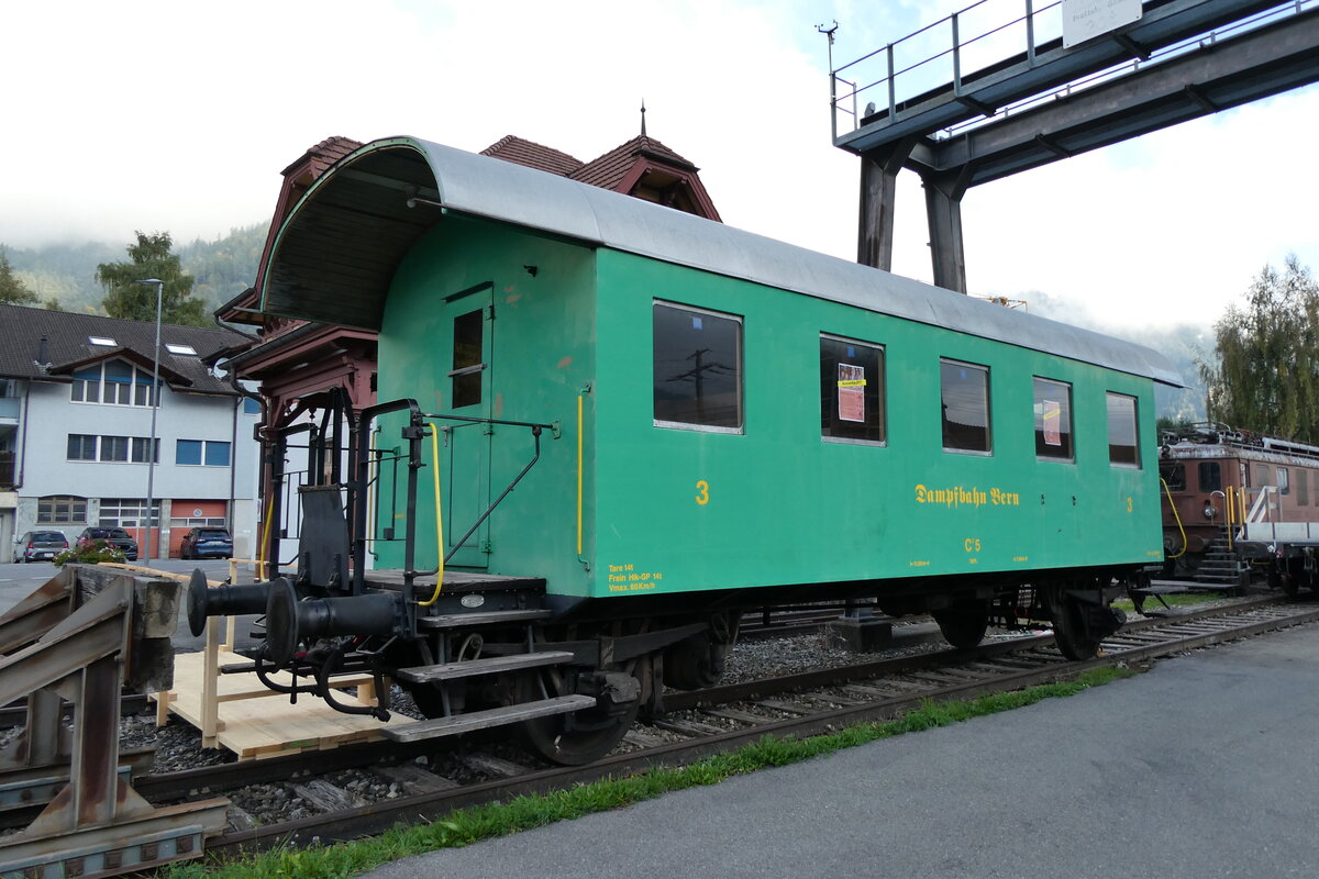 (280'846) - Dampfbahn Bern-Personenwagen - Nr. 5 - am 1. Oktober 2025 beim alten Bahnhof Frutigen