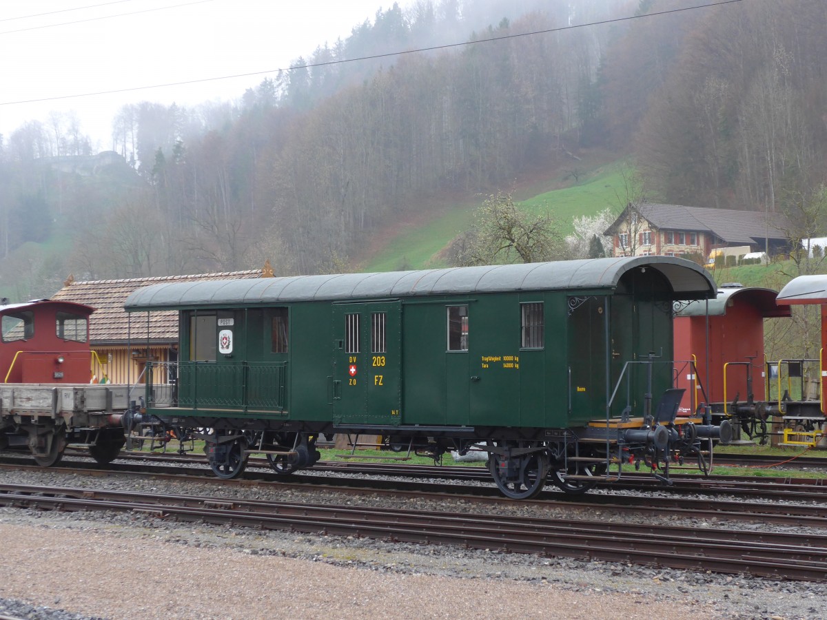 (149'564) - DVZO-Postwagen - Nr. 203 - am 6. April 2014 im Bahnhof Bauma