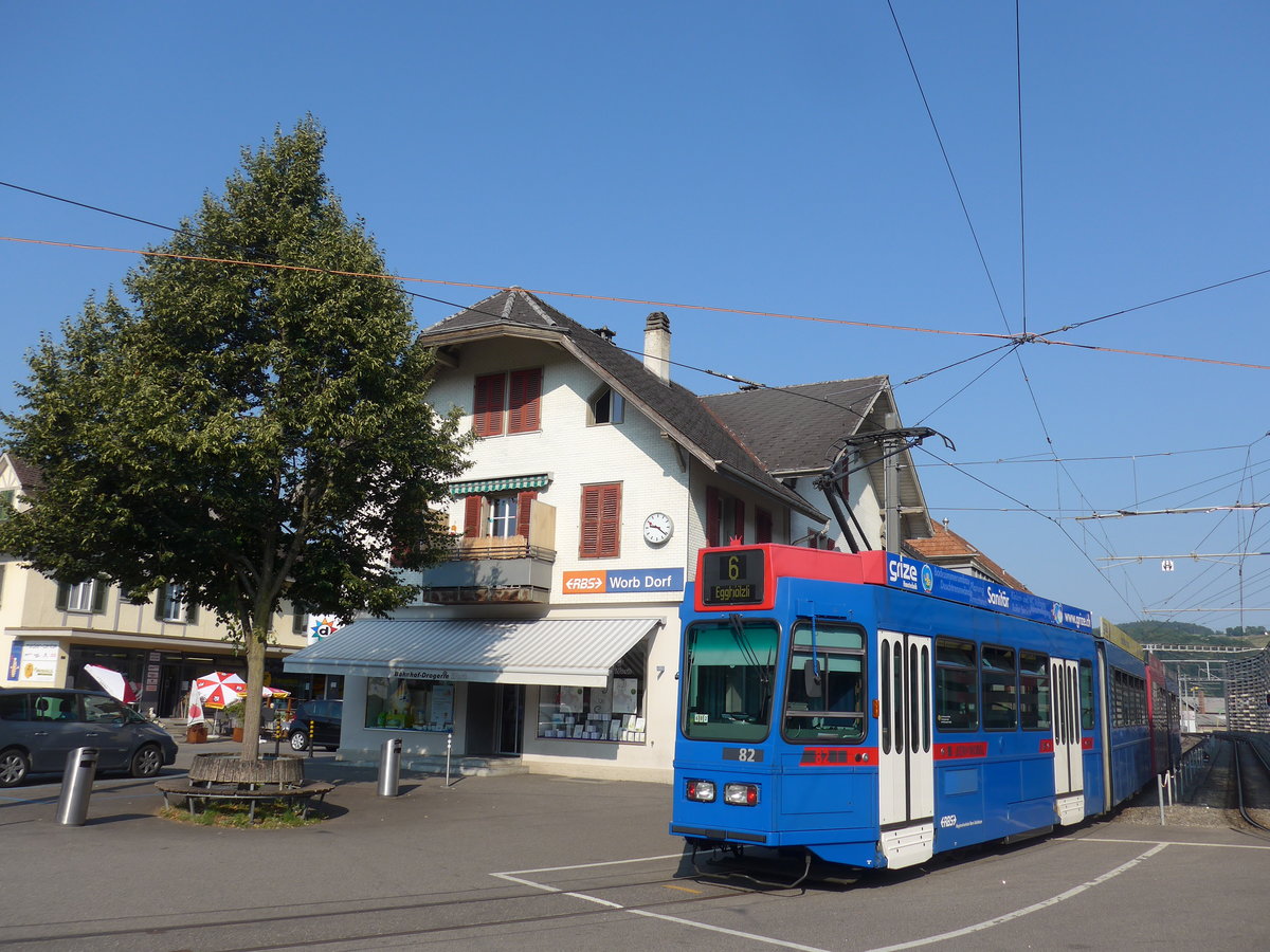 (195'533) - Bernmobil-Tram - Nr. 82 - am 5. August 2018 beim Bahnhof Worb Dorf