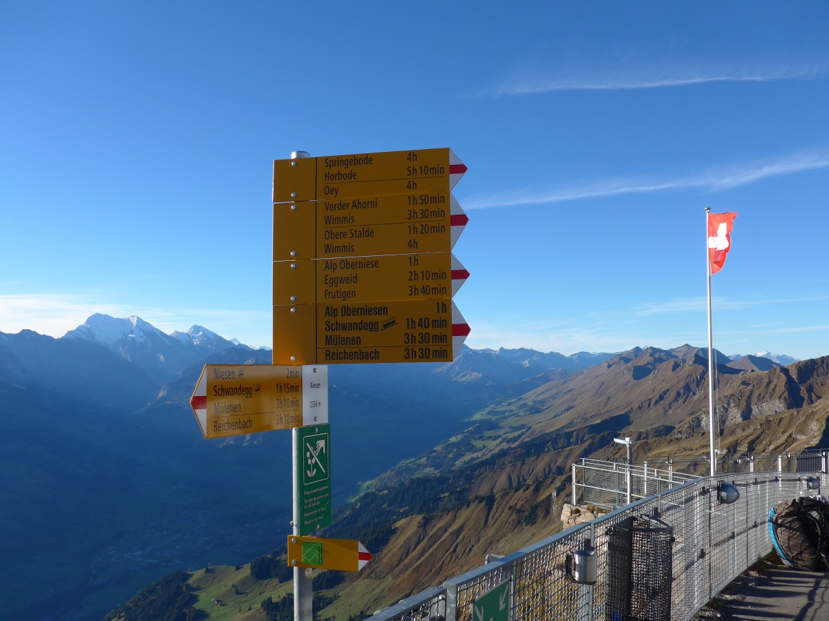 (155'802) - Wegweisen und Schweizerfahne am 19. Oktober 2014 auf dem Niesen