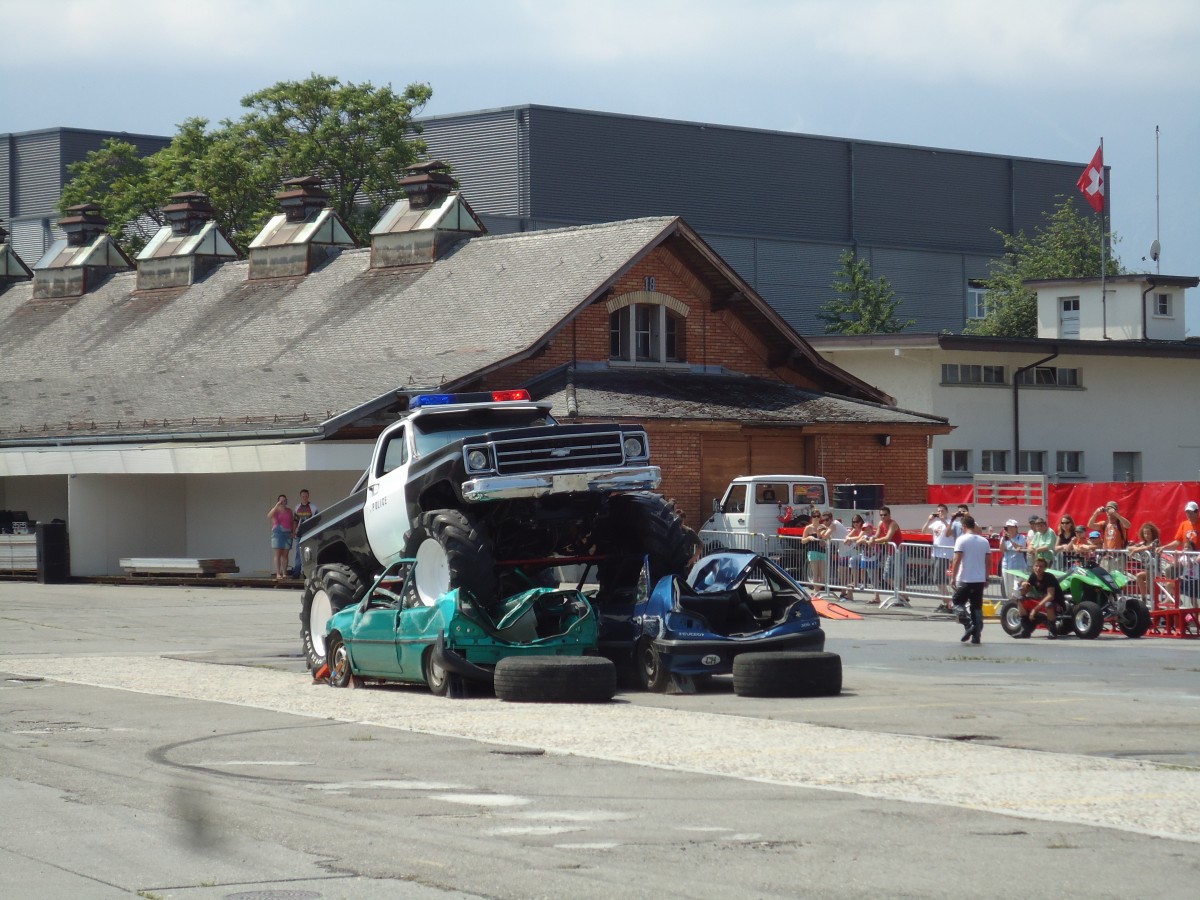 (145'644) - Chevrolet von Hell Driver überquert zwei Peugeots am 7. Juli 2013 in Thun, Expo