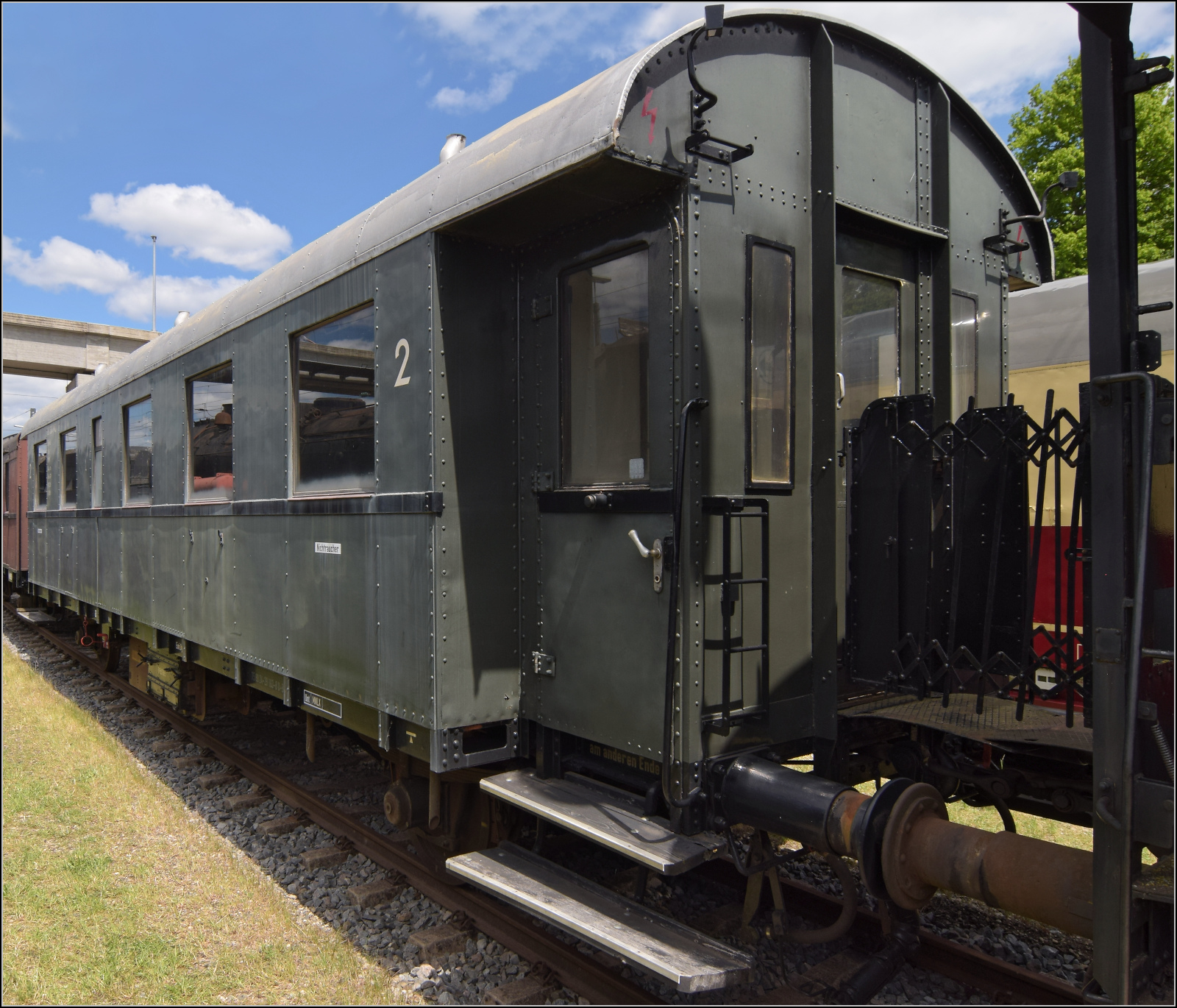 Diese Donnerbüchse hat geschlossene Plattformen beim Einstieg und gehört zur Gattung Bi-29 und ist ein Ganzstahl-Austauschwagen (alle Teile vereinheitlicht und herstellerunabhängig austauschbar). Der Wagen wurde 1930 von LHB geliefert und bekam nur kurz später die Nummer 27 237 Erfurt. Im Jahr 1938 wurde er zu einem BCi-29a umgebaut. Mit Umweg über die ÖBB bis 1982 kam der Wagen zum BEM, offenbar entging er in Österreich dem Umbau zu einem Spantenwagen. Nördlingen, Juni 2025.