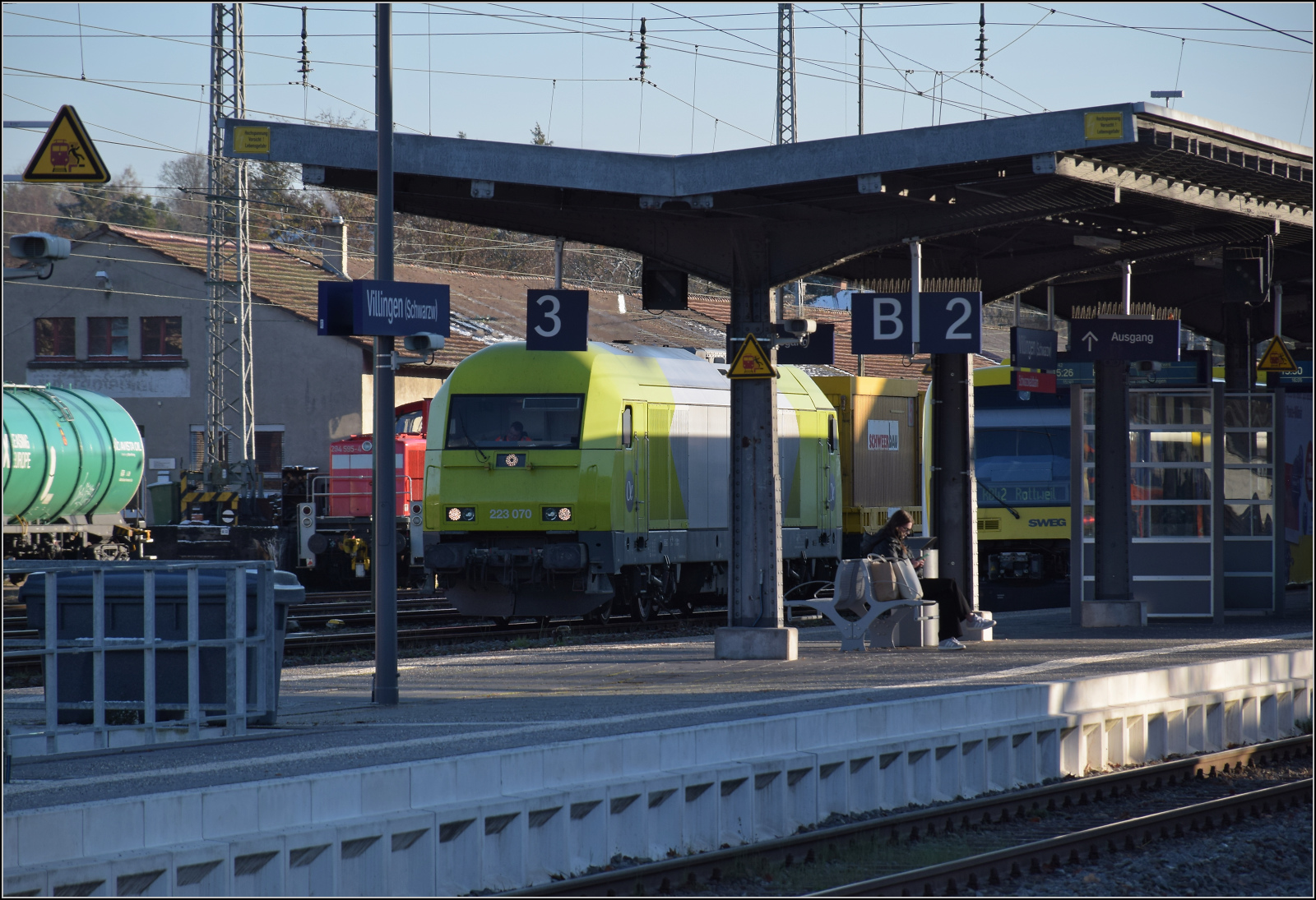 223 070 von Alphatrains ist mit der Baustelle in Villingen beschäftigt. November 2025.