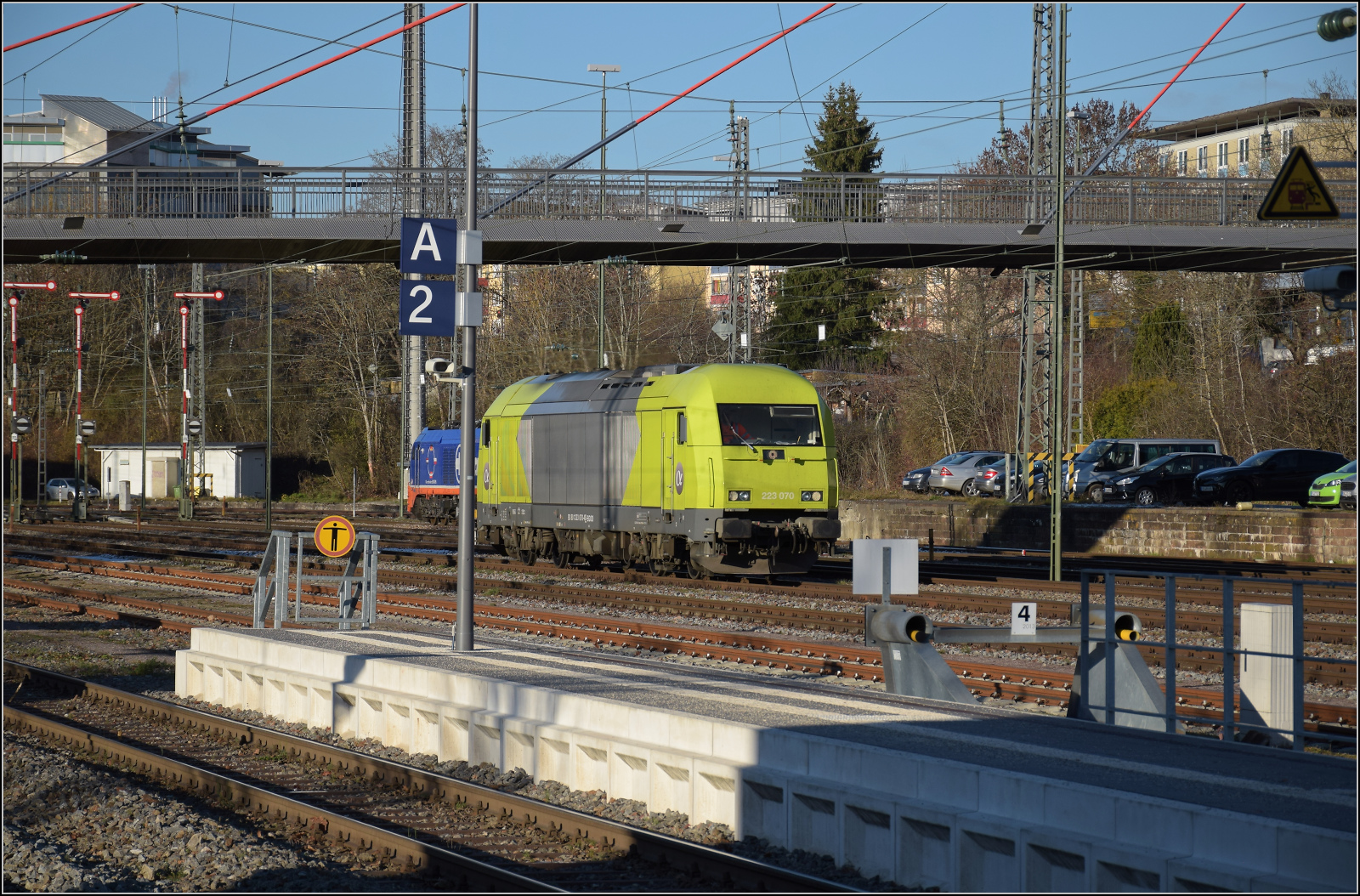 223 070 von Alphatrains ist mit der Baustelle in Villingen beschäftigt. November 2025.