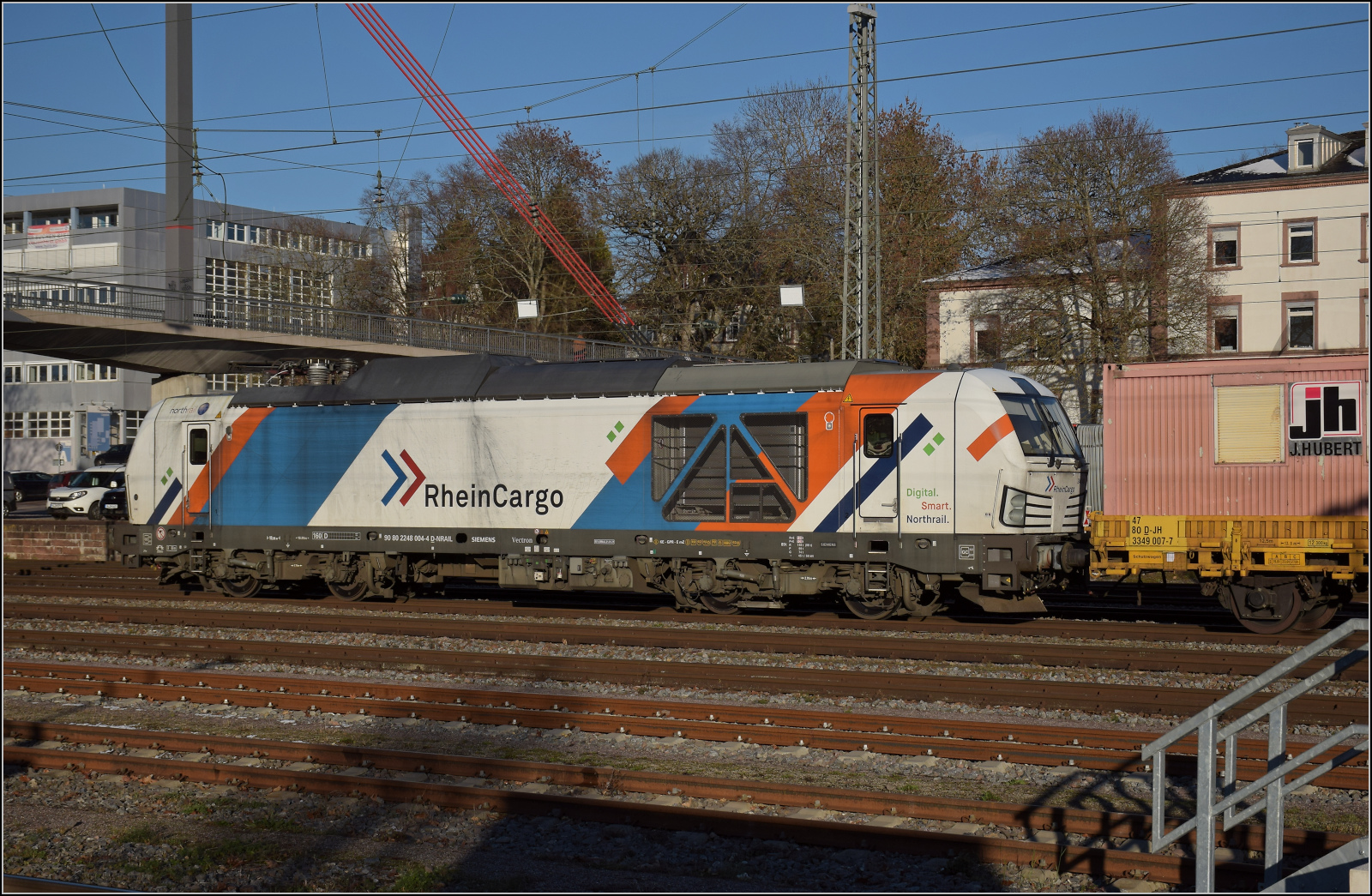 248 004 von North Rail ist mit der Baustelle in Villingen beschäftigt. November 2025.