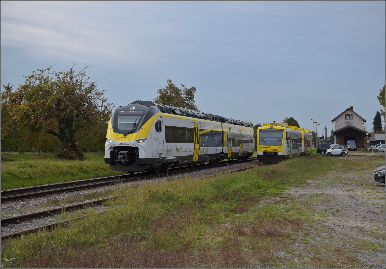 Oberachern ist tatsächlich noch ein Bahnhof, denn eine Weiche ist noch vorhanden. Hier haben momentan überzählige 650er Platz, im Bild vorne SWEG 519, dahinter SWEG 514. Ganz offenbar hat die SWEG nicht ganz das Fell des Bären verkauft, bevor man sich sicher ob der Funktion der Akkuzüge war. Oktober 2025.