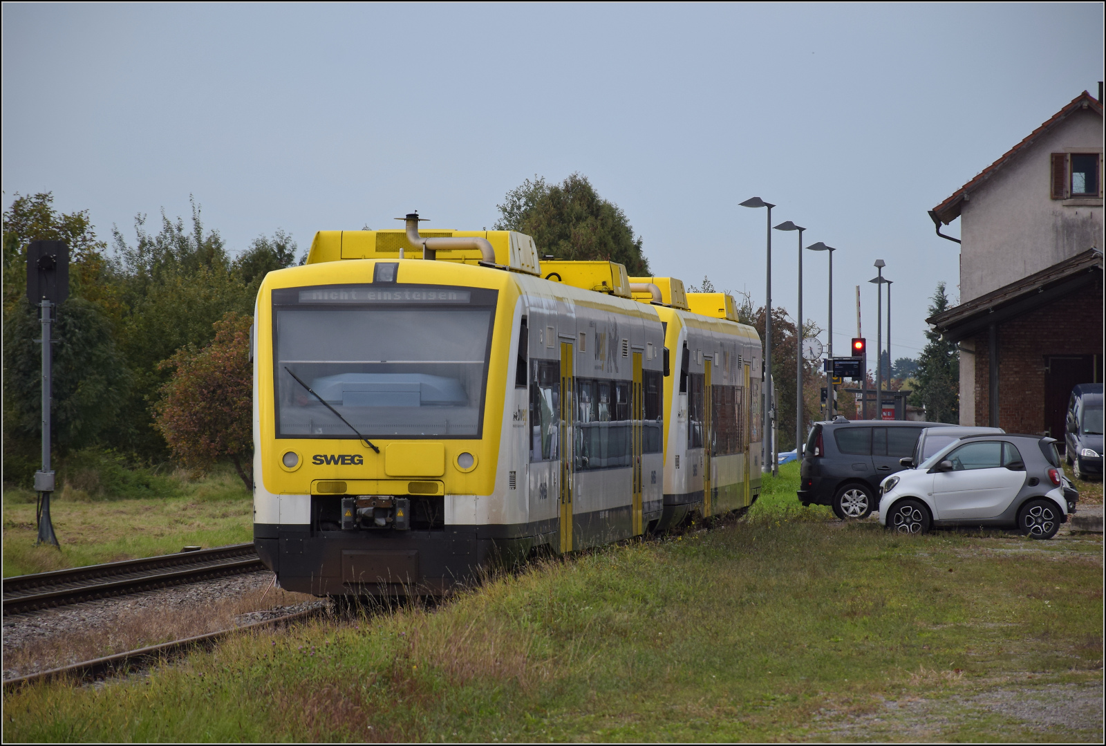 Mit Dampf zur Winzer-Kirwi. Oberachern ist tatsächlich noch ein Bahnhof, denn eine Weiche ist noch vorhanden. Hier haben momentan überzählige 650er Platz, im Bild vorne SWEG 519, dahinter SWEG 514. Ganz offenbar hat die SWEG nicht ganz das Fell des Bären verkauft, bevor man sich sicher ob der Funktion der Akkuzüge war. Oktober 2025.