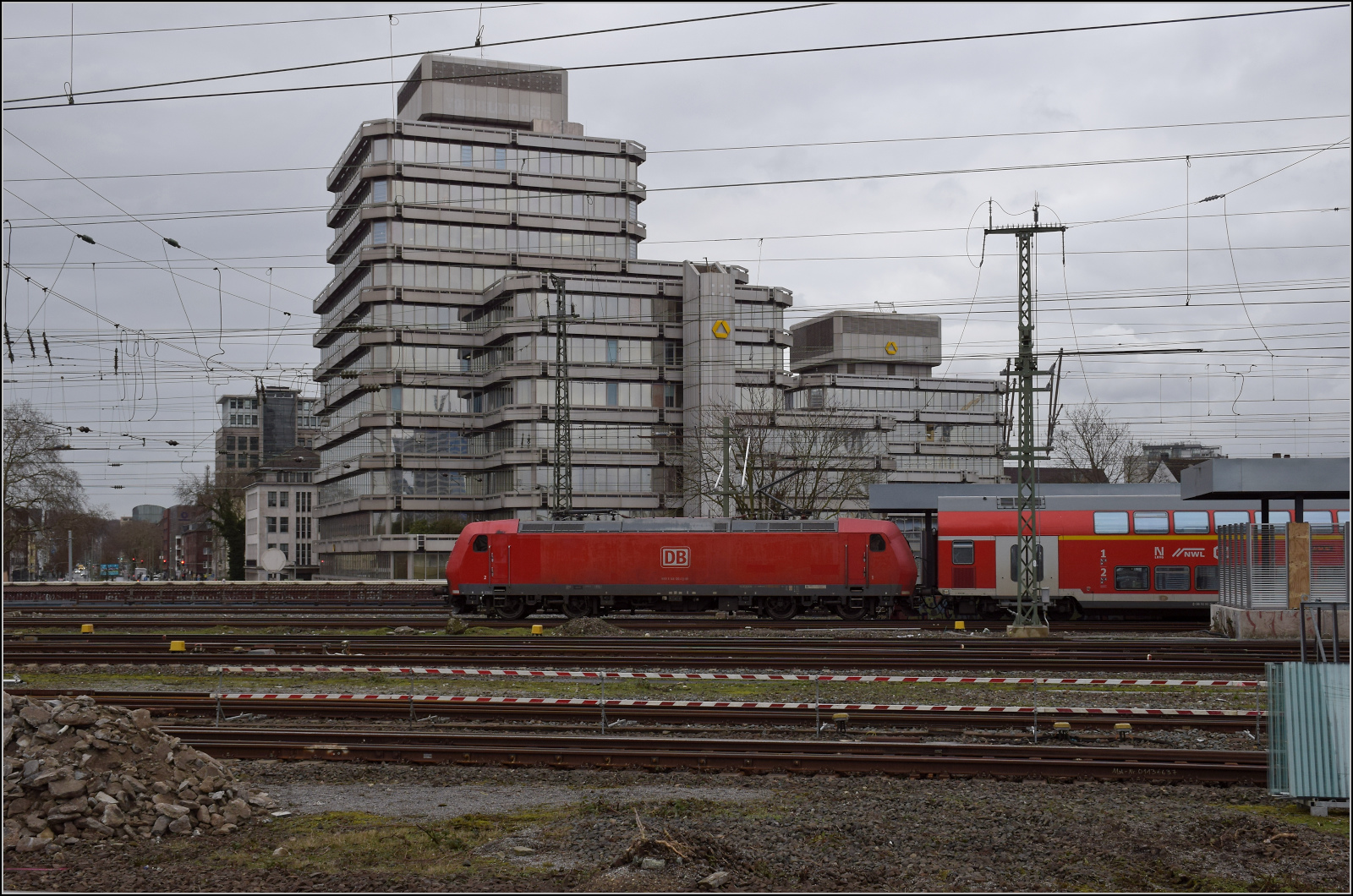 Die ehemalige Lok vom Oberrhein, 146 112 hat vor einigen Jahren an den Niederrhein gewechselt und schiebt einen RE nach Duisburg. Februar 2026.