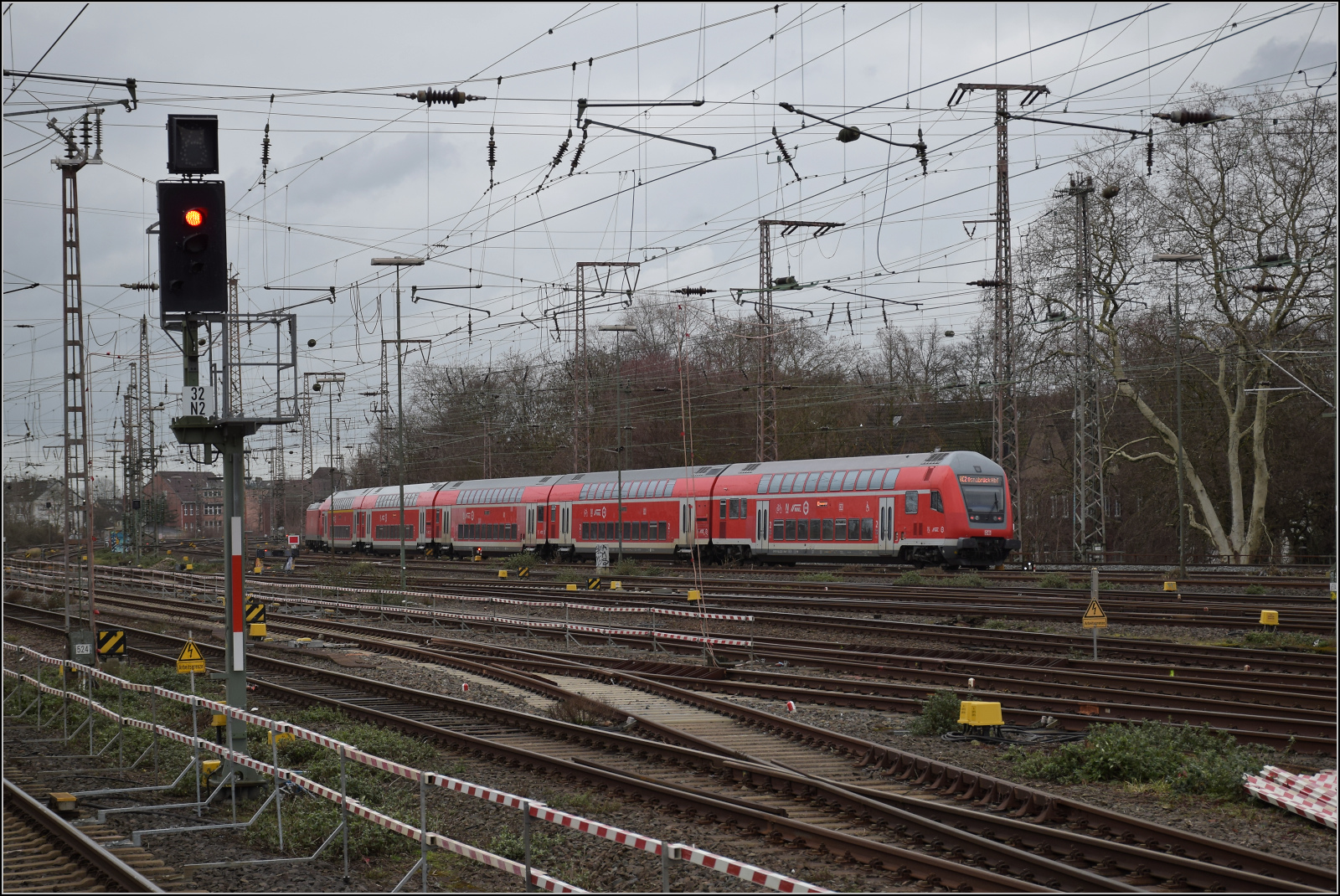 Der klassische DB-Dostozug fährt mit 146 120 nach Osnabrück aus. Duisburg, Februar 2026.