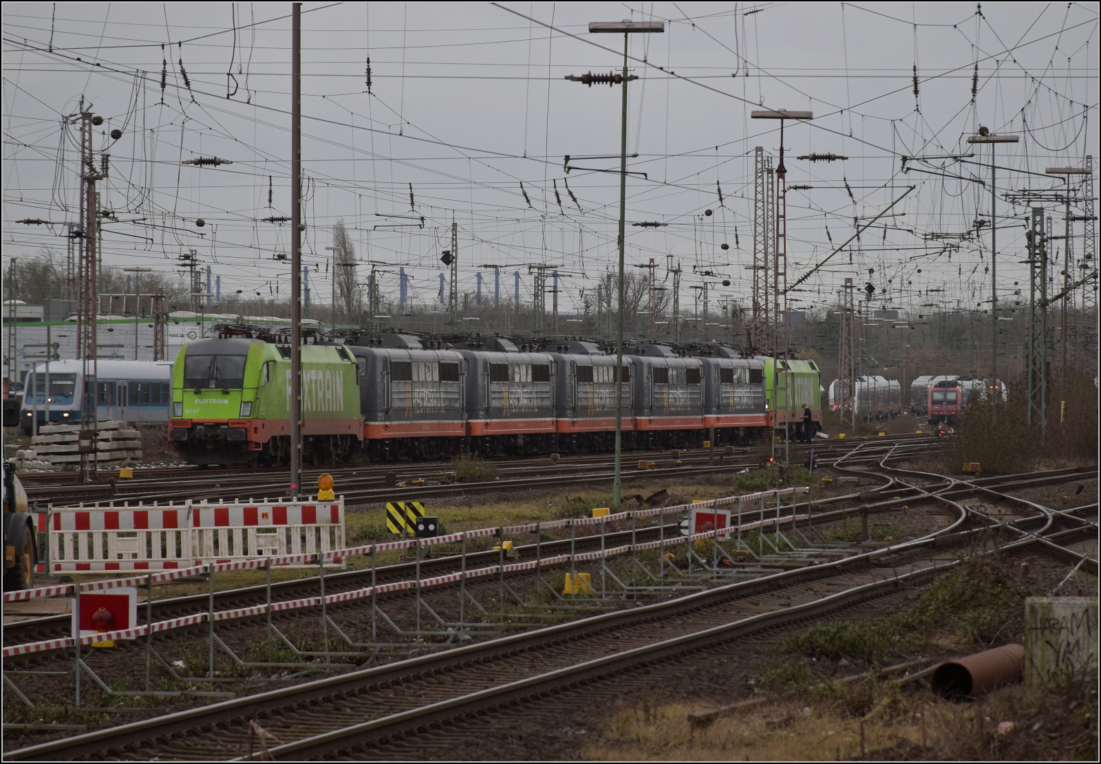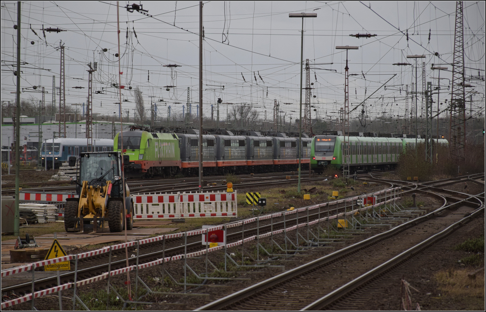 Der polnische Vectron 91 51 5370 030-6 PL-PKP zieht jede Menge neue Containertragwagen durch Duisburg. Daneben ist 151 075 von SRI mit den verschiedenen Gesichtern geparkt. Februar 2026. km0