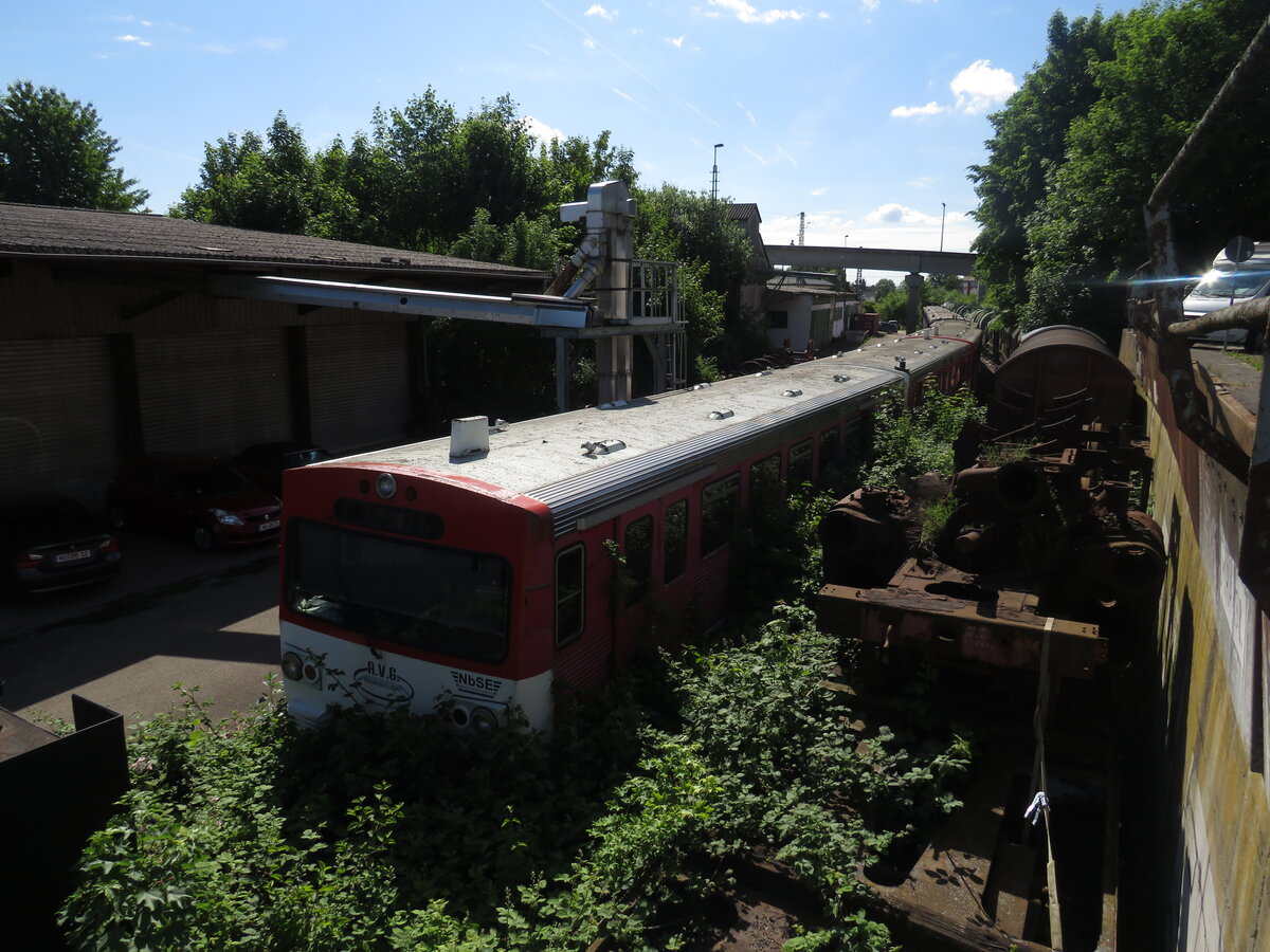 VT2E/VTA (ex. A.V.G. Ascherslebener Verkehrsgesellschaft) steht neben den Bahnhof Nördlingen in der Abstellung. 30.Mai.2025
