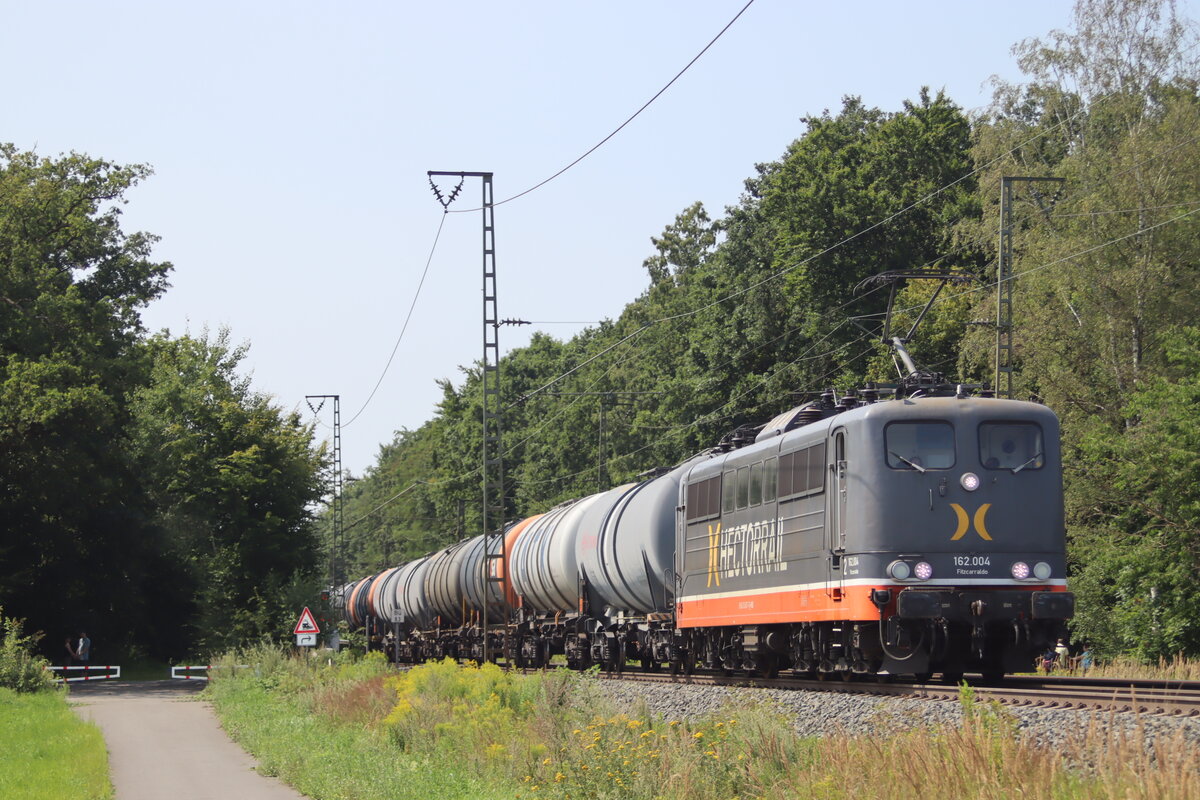 BR 161 004 von Hectorrail zieht einen Kesselzug Richtung Magdeburg durch Weddel am 9.08.2025