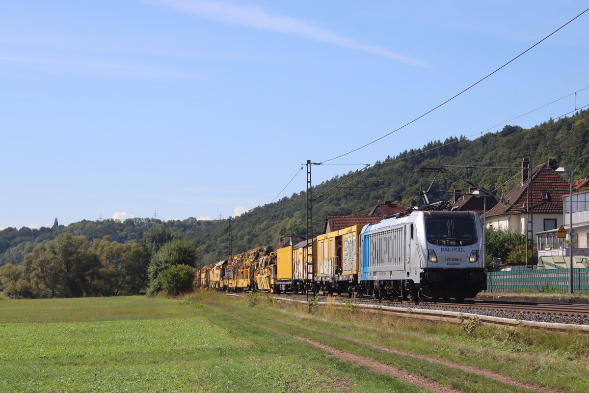 BR 187 006 von Railpool fährt mit einem Bauzug von Schweerbau durch Ludwigsau Friedlos Richtung Bebra am 6.September.2025