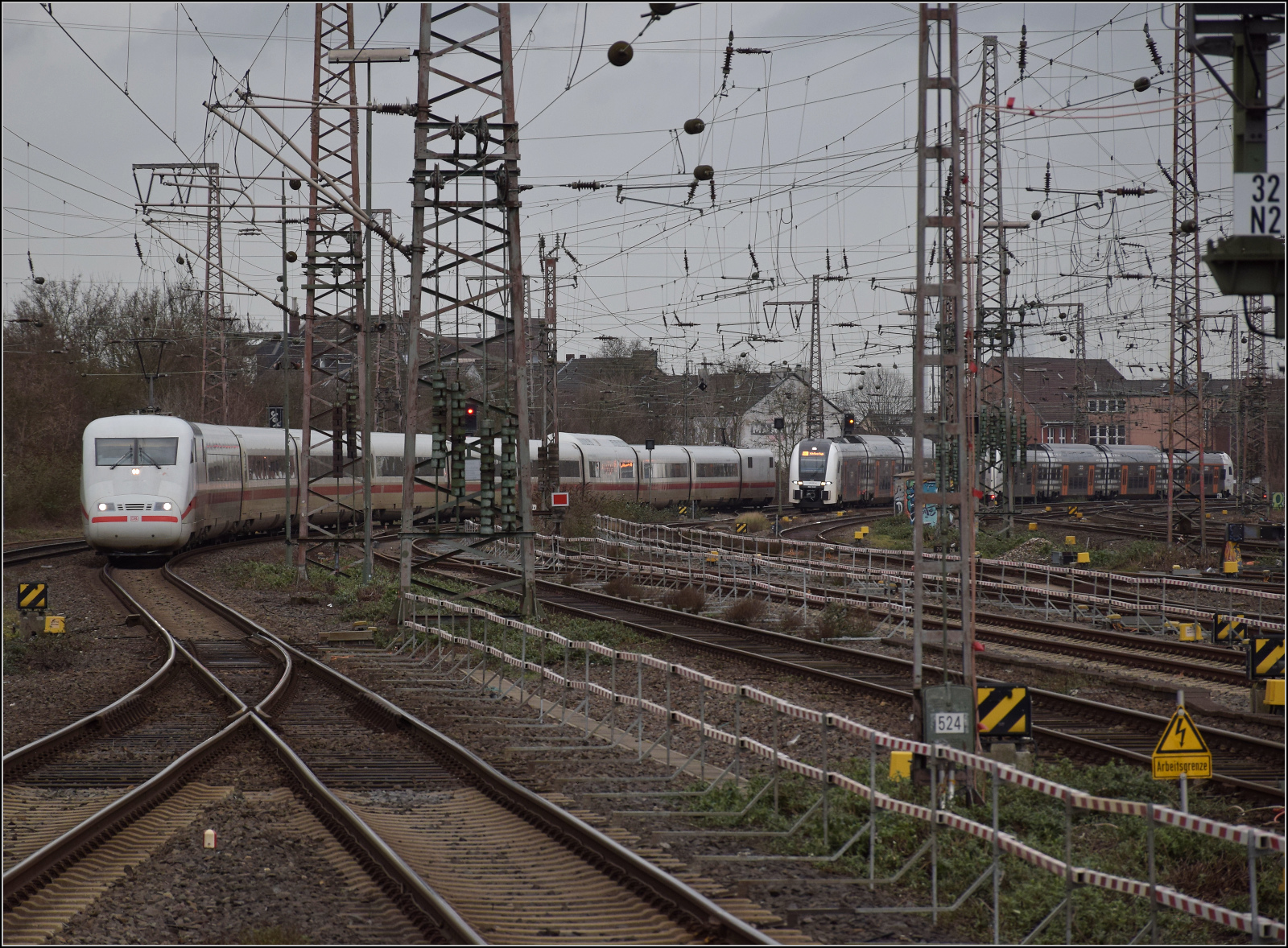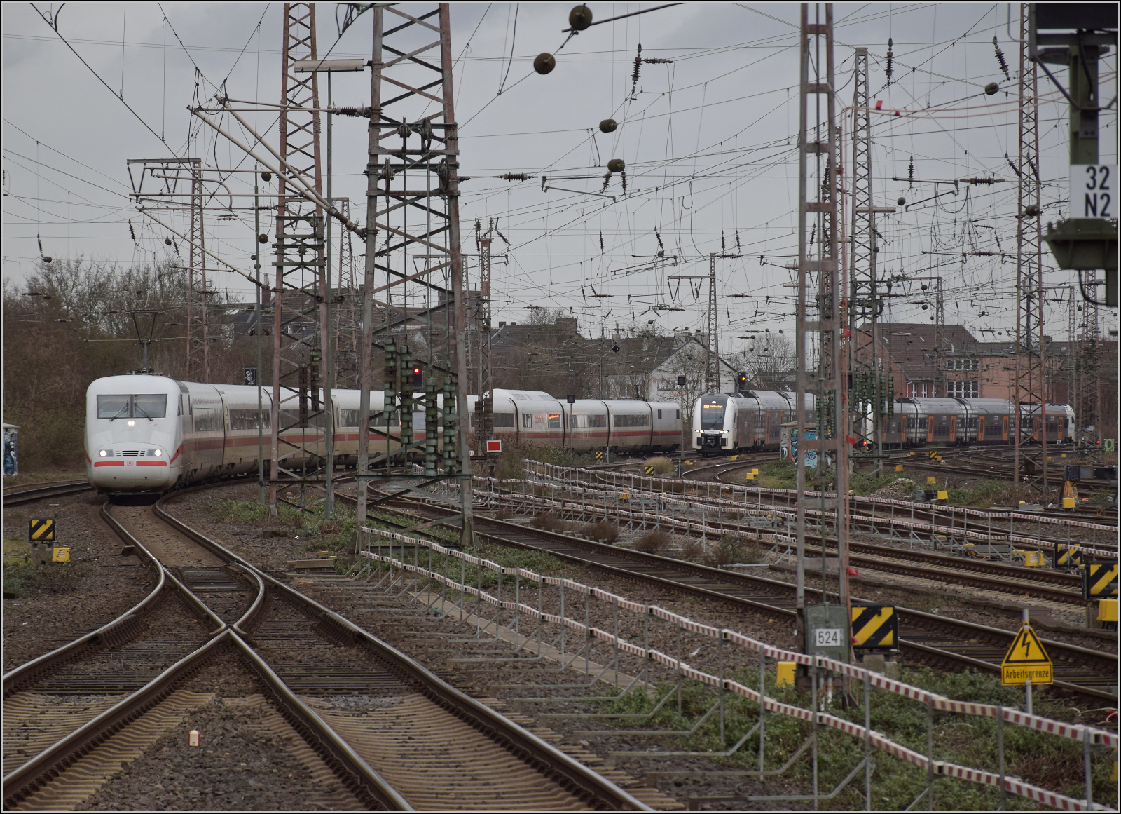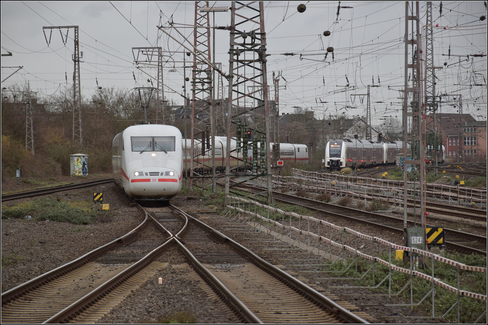 401 013 und ein Duo aus Desiro HC des RRX mit 462 039 an der Spitze treffen gleichzeitig in Duisburg ein. Februar 2026.