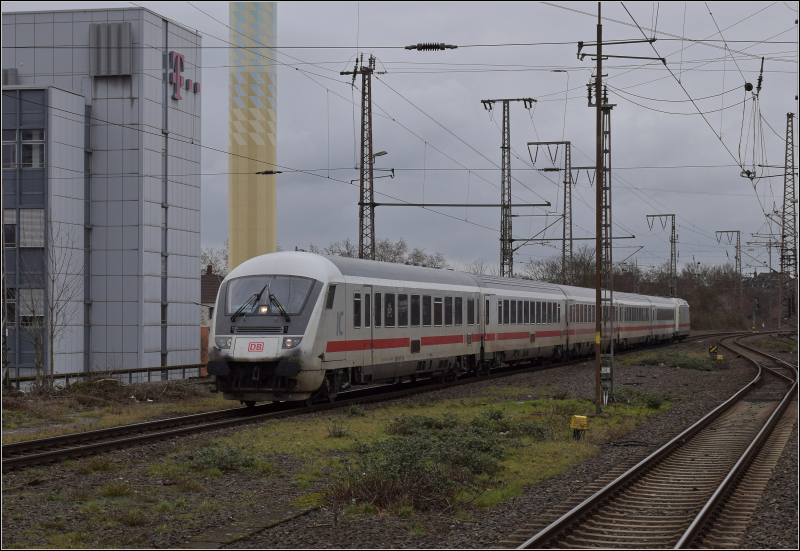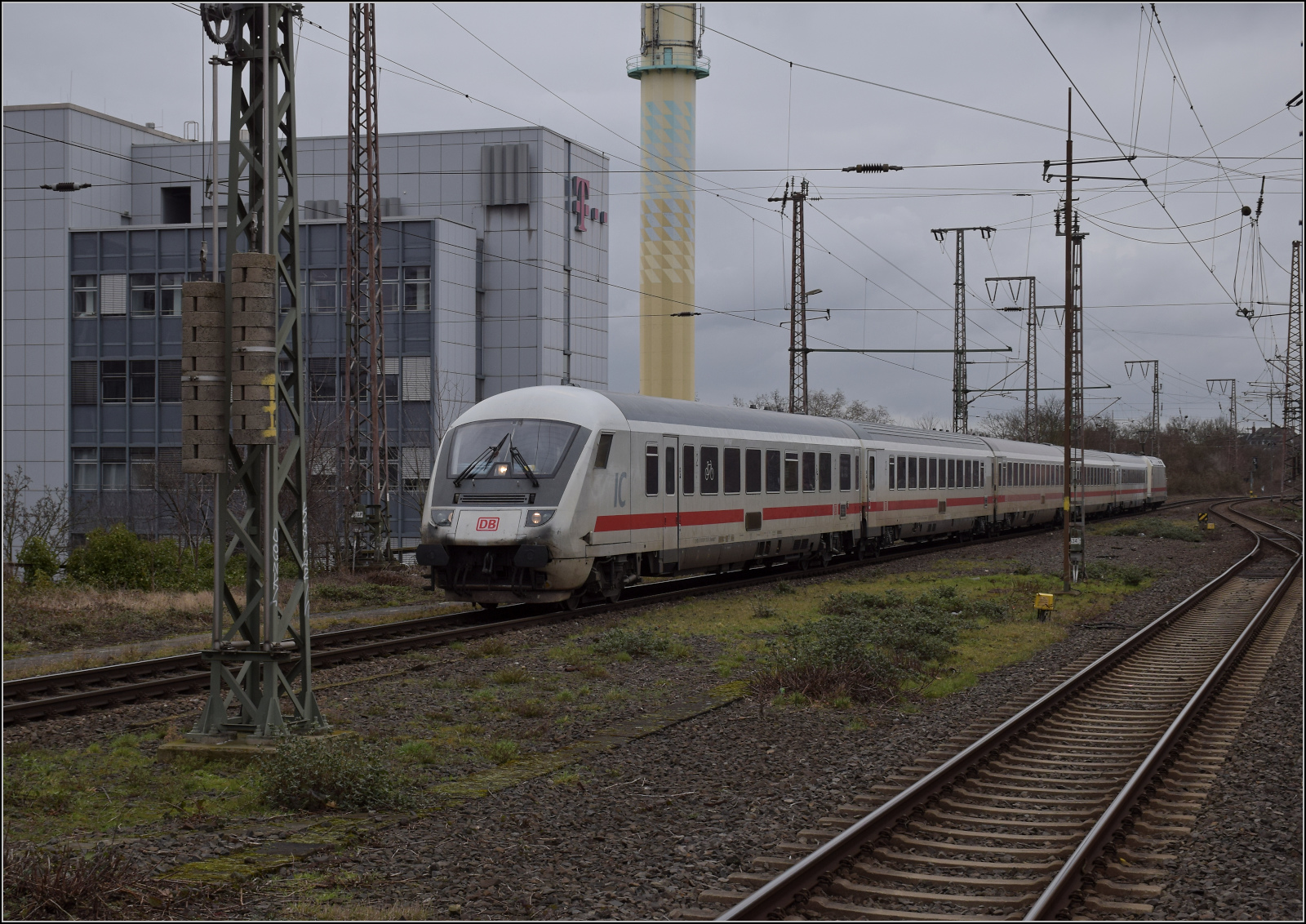 Niemand versteht, warum ein IC1 erst kurz vor ihrer endgültigen Ausmusterung einen durchgehend einheitlichen Anstrich bekommen hat. Die passende Lok 101 013 ist im Duisburg auf dem Güterzuggleis am Zug. Februar 2026.