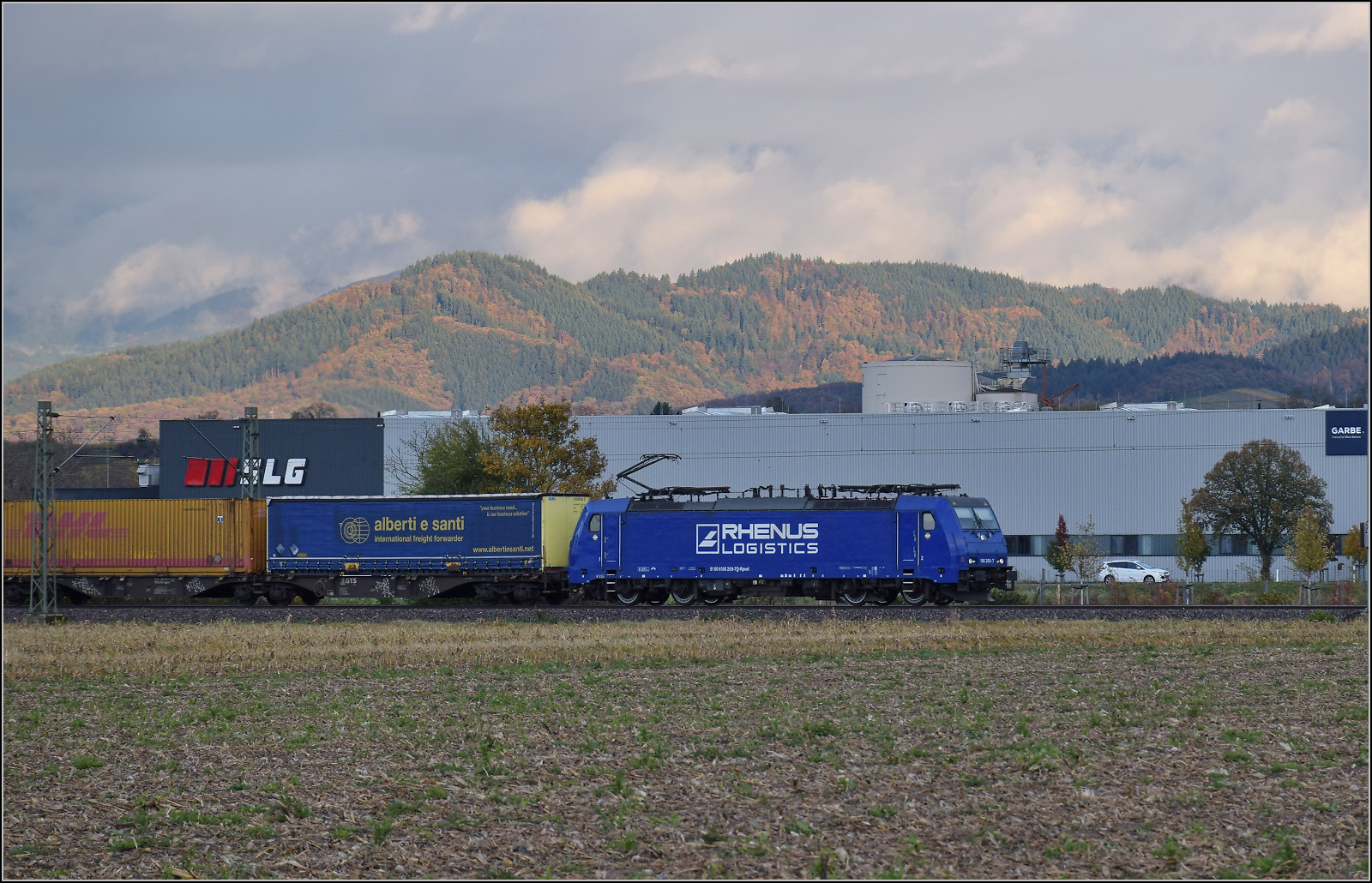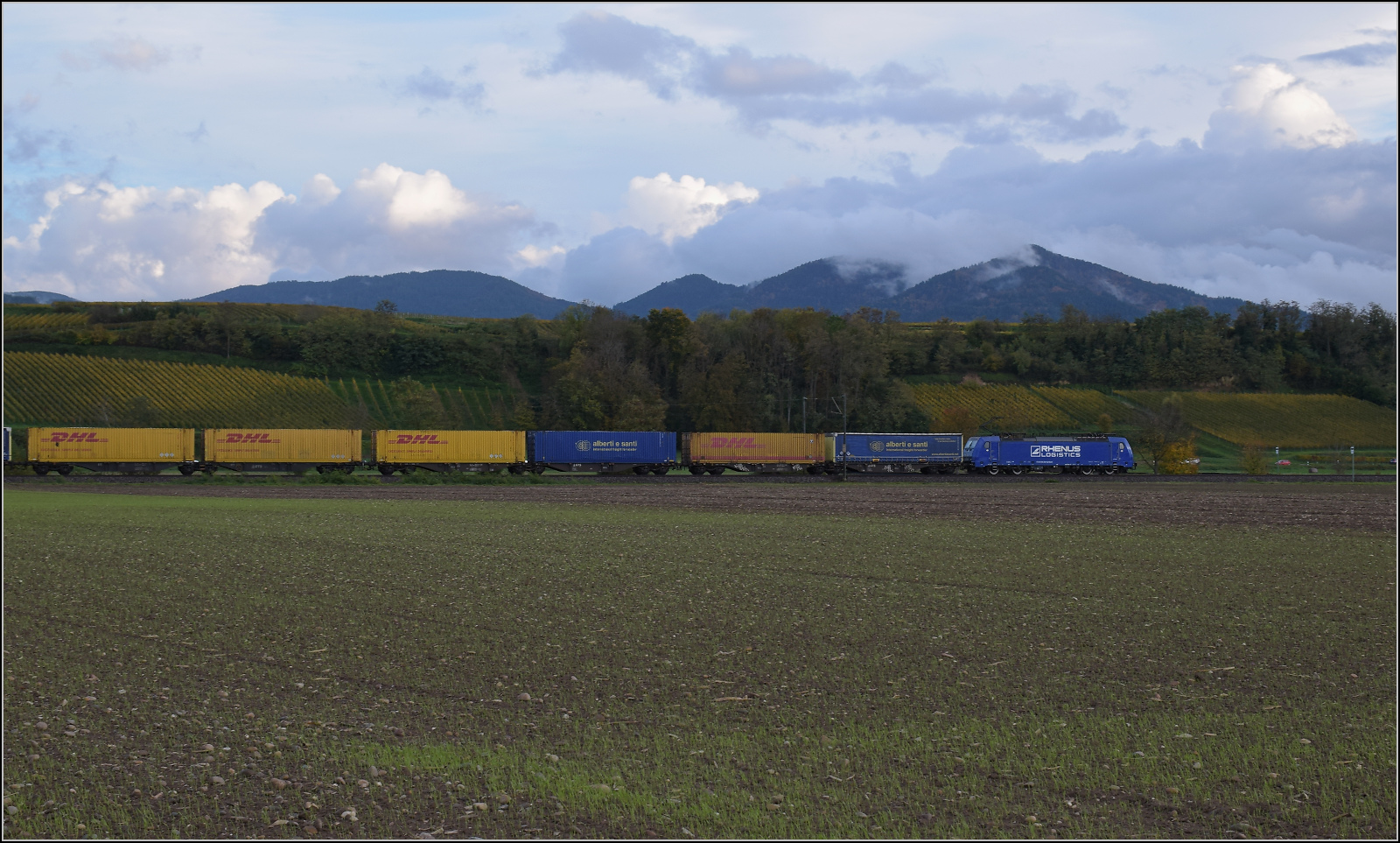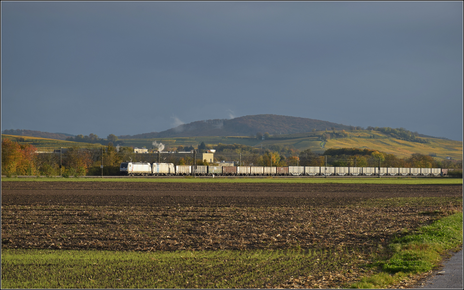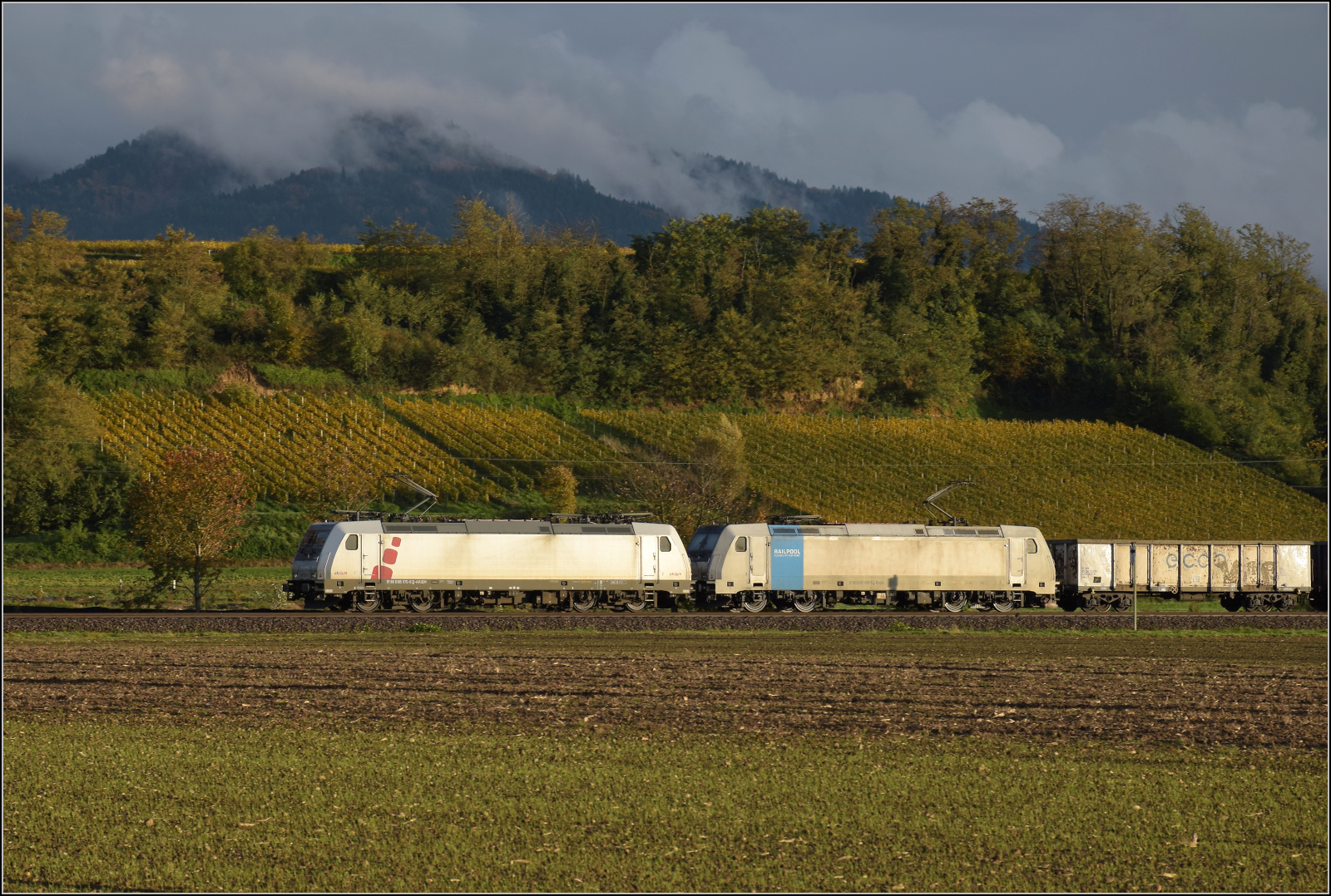 185 570 von Akiem und 185 690 von Railpool bei Hügelheim. Oktober 2025