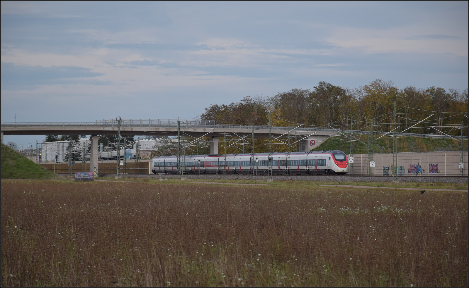 RABe 501 037 mit verschämt kleiner Aufschrift 'Baden-Württemberg' auf dem Weg nach Frankfurt. Unterdessen ist 193 524 'Limmat' ist südwärts unterwegs. Oktober 2025.