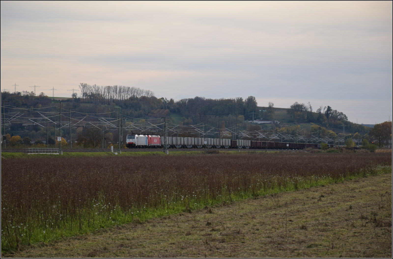 186 452 von Railpool und 185 586 Akiem fahren zur Abholung weiterer Rüben nach Norddeutschland. Oktober 2025.