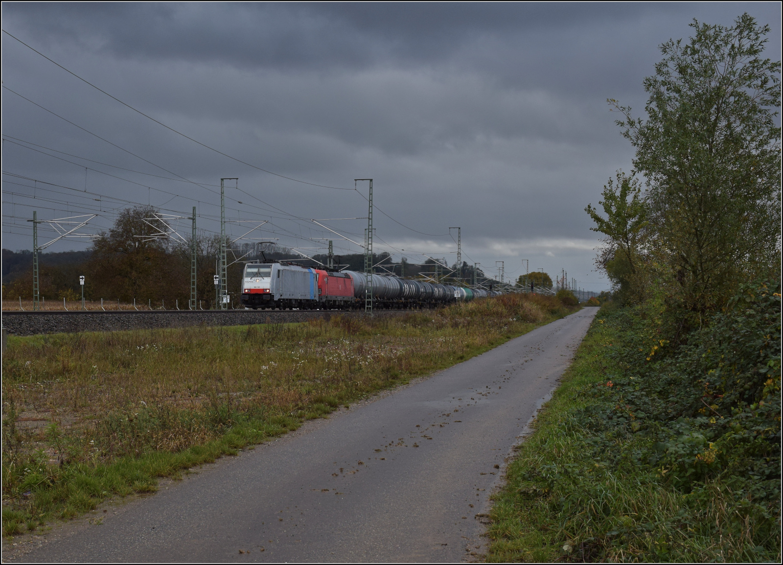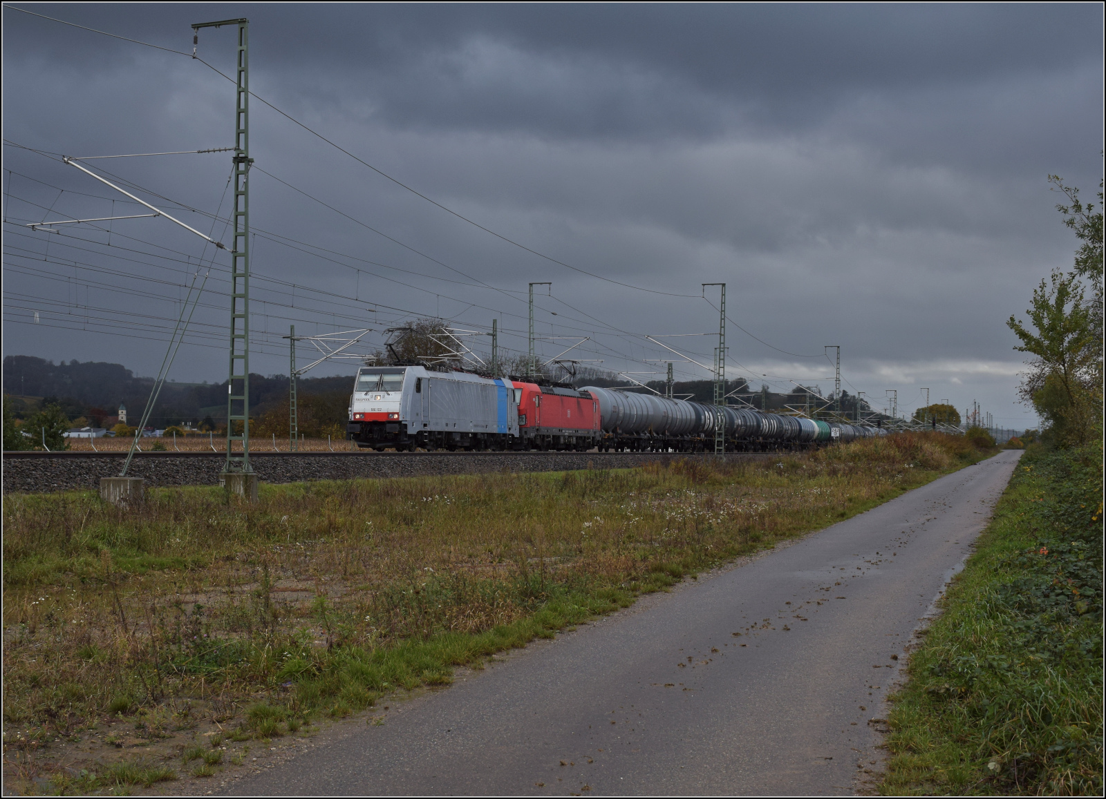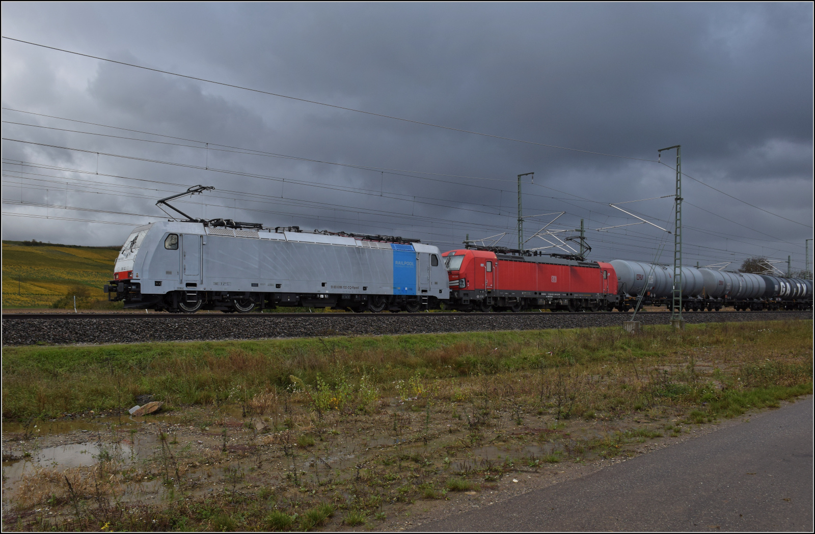 Ein Zebra am Oberrhein, welche Seltenheit. 186 102 Railpool als Zebra verkleidet im Bild und 193 349. Schliengen, Oktober 2025.