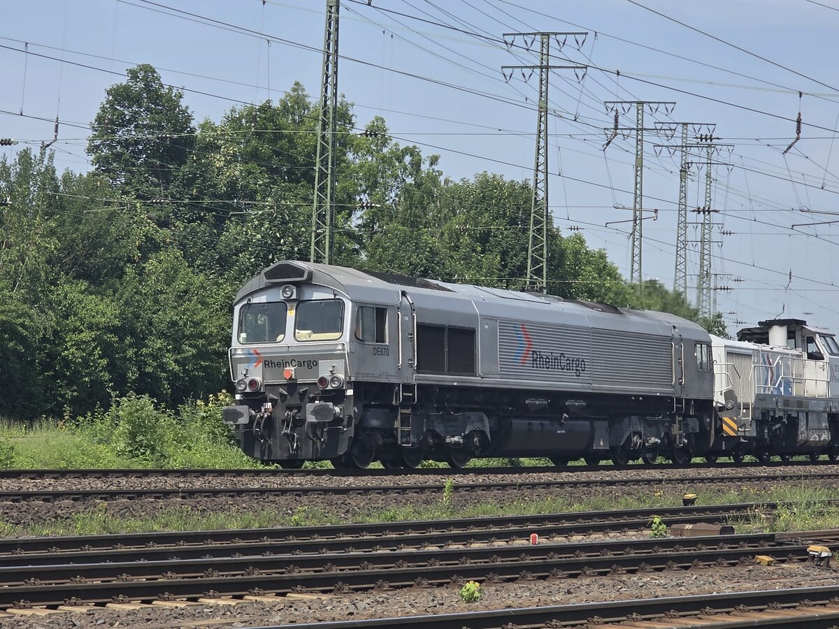 BR 266 070-2 (DE670) und BR 4815 039 (DE510) von RheinCargo als Lokzug bei der Vorbeifahrt DB Museum Koblenz. 14.06.2025