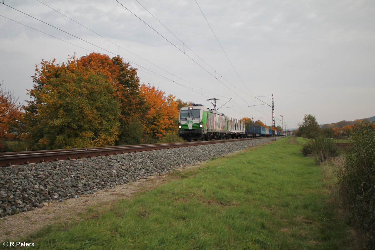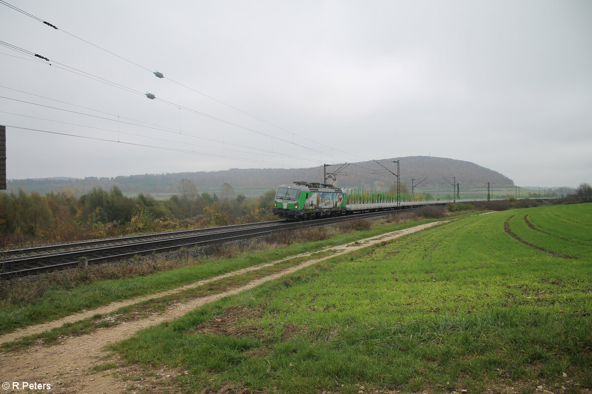 193 691-3 "Bertha von Suttner - Waffen Nieder" zieht bei Treuchtlingen ein leeren SFlexwood Zug in Richtung Norden. 01.11.24