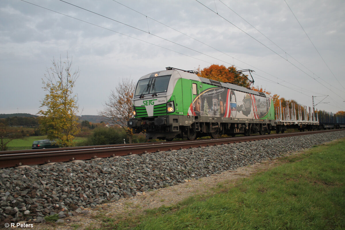 193 219  Stille Nacht  zieht ein leeren Holztransportzug bei Thüngersheim in Richtung Norden. 20.10.24
