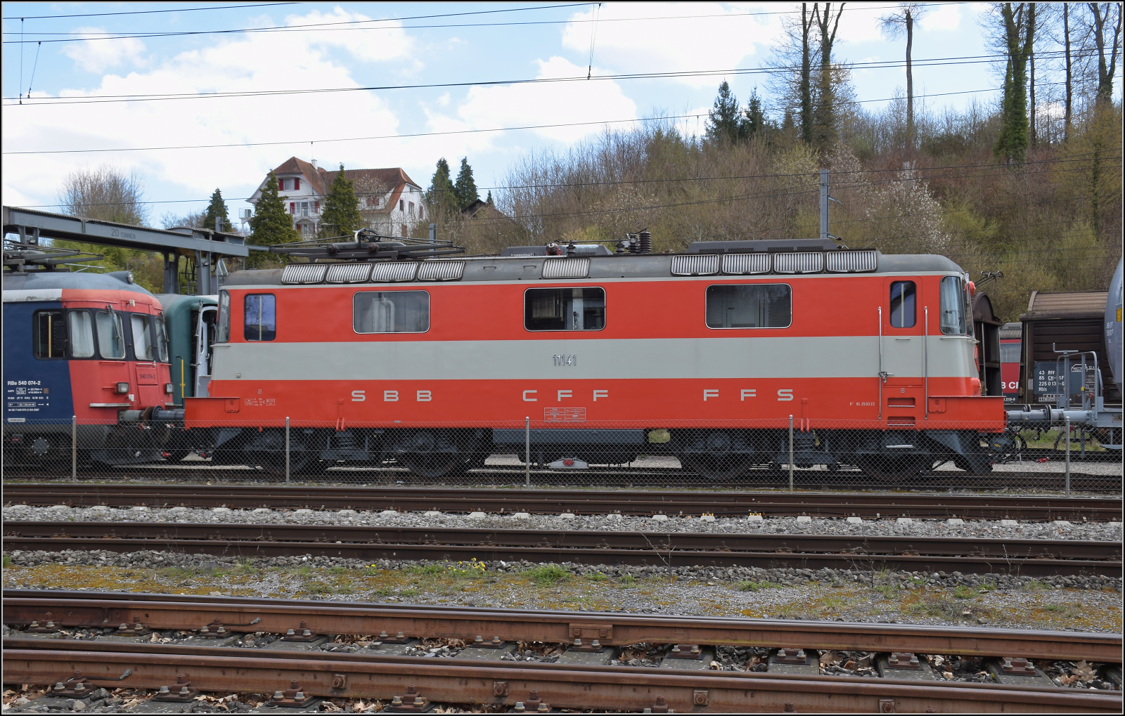 Die Museumslok der DSF, Re 4/4 II 11141, in Koblenz, ihre Einsätze in rot vor den Gäubahn-IC sind noch nicht allzulange her. Koblenz, April 2026.