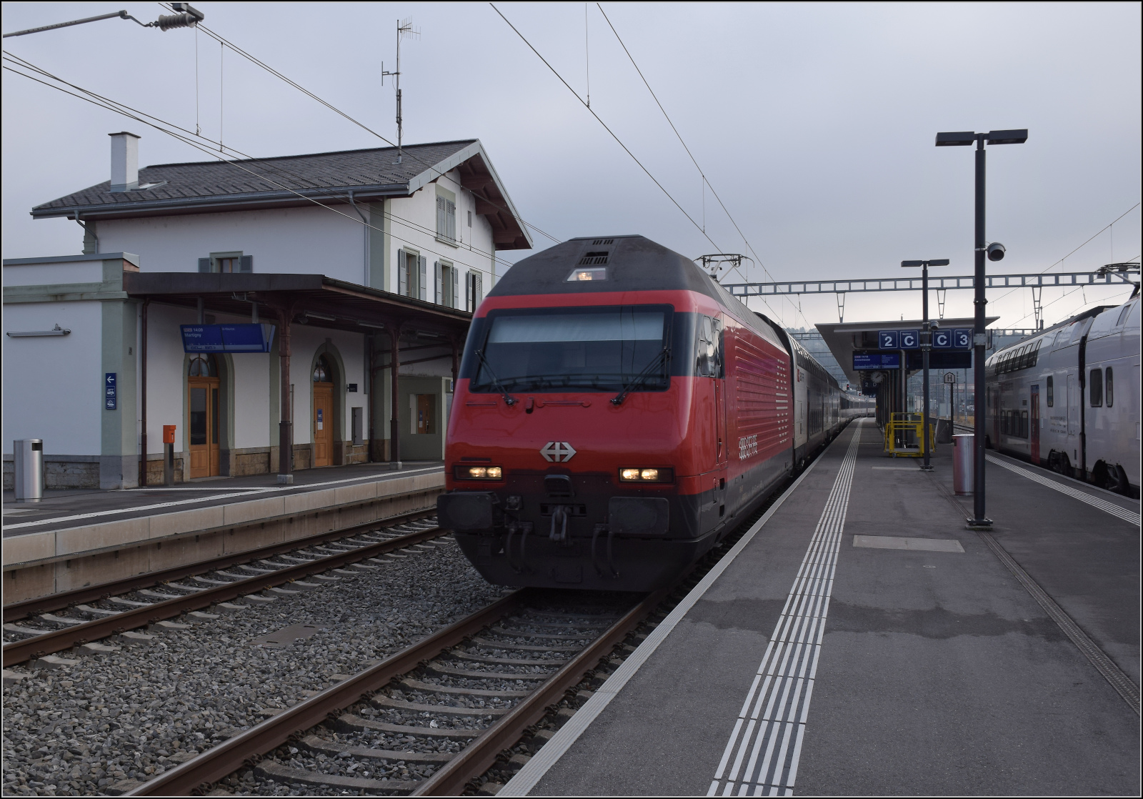 Während wir uns um die Zugkreuzung kümmerten, die entstandenen Bilder begutachteten und den beginnenden Spaziergang entlang der Strecke besprachen, fielen kurz diese Worte: "Die Schönheit der Strecke ist berauschend, nur der Zugverkehr selber ist recht eintönig, also braucht es mehrere Ortswechsel." Zur Strafe für die Bemerkung langweilig schlich sich von hinten völlig unbemerkt direkt an uns diese Zugkomposition vorbei. Re 460 014 'Val de Trient', der Messtriebwagen XTmass 160 001, der Infrastrukturdiagnosewagen X 99 85 93-61 247-1 CH-SBBI und der IC-Steuerwagen Bt 50 85 28-94 918-5 CH-SBB. Diese Strafe ist wirklich annehmbar. Mittelhäusern, Januar 2026.