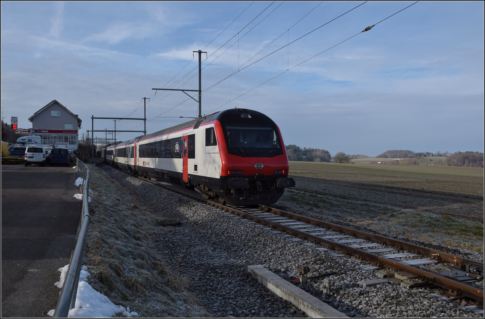 Der von Re 460 014 'Val de Trient' gezogene Messzug in Mittelhäusern. Im Bild der IC-Steuerwagen Bt 50 85 28-94 918-5 CH-SBB. Januar 2026.