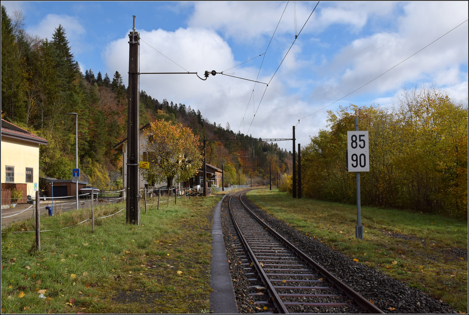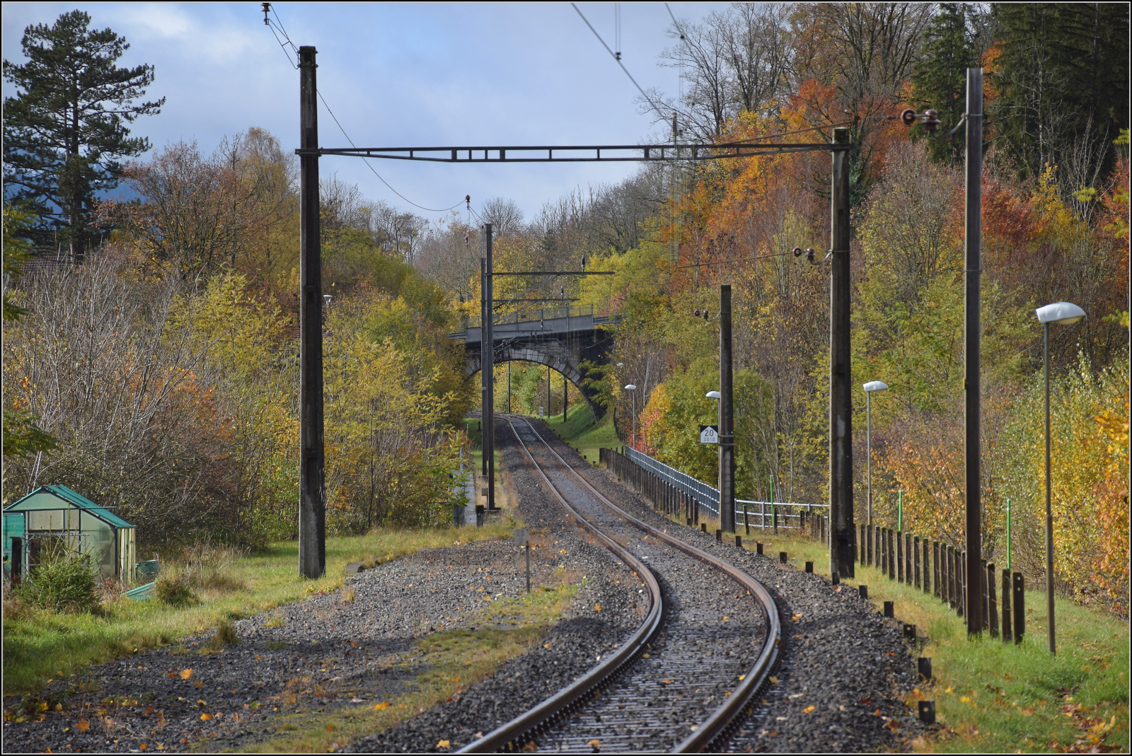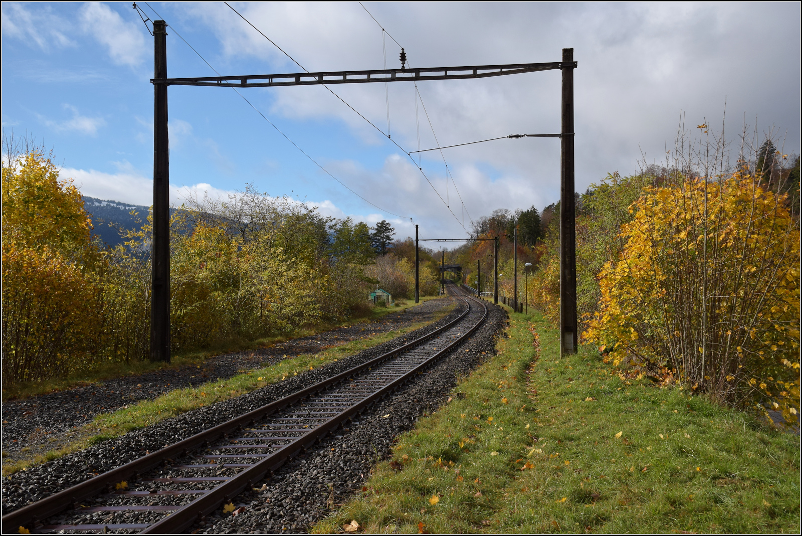 An der Strecke von Neuenburg nach Paris. Ein unbeschrankter Bahnübergang bei Plancemont regelt vor allem den landwirtschaftlichen Verkehr und bremst sonst meist sechsmal am Tag ein paar Spaziergänger aus. Oktober 2025.