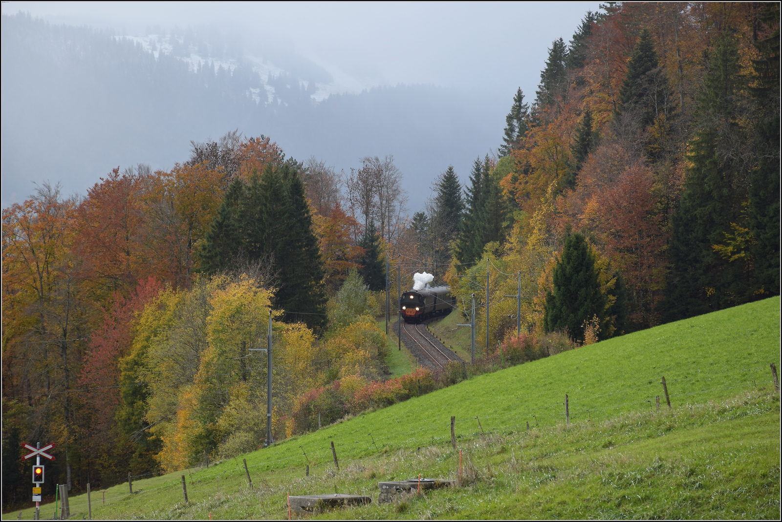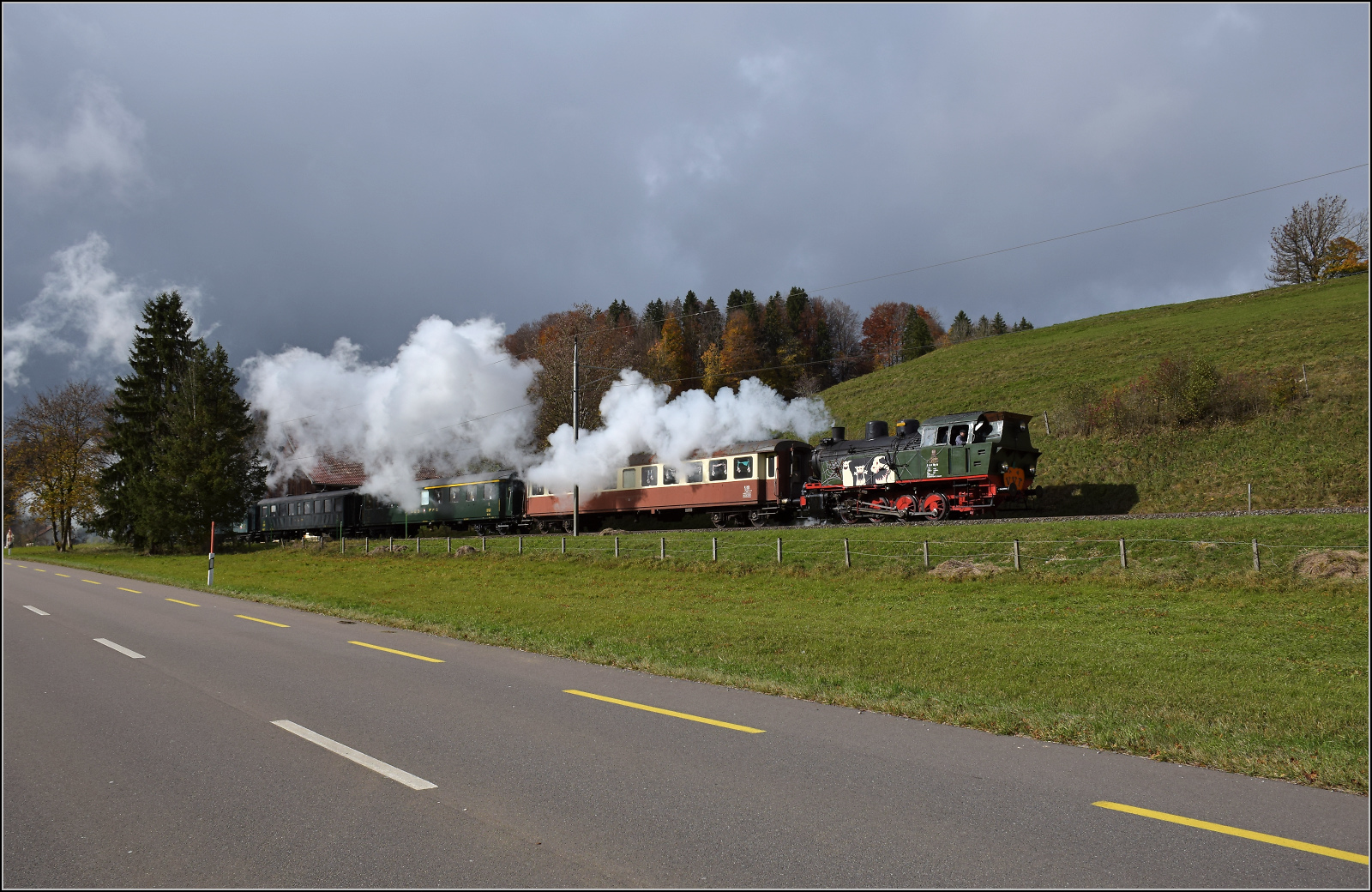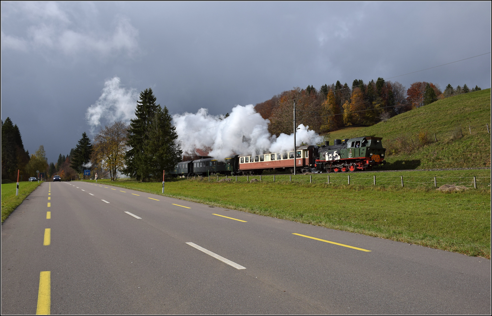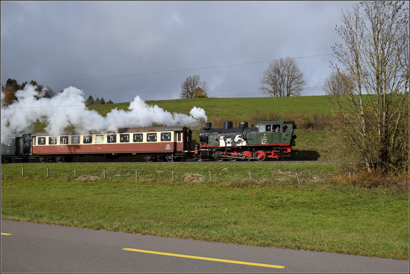 Gruseln zwischen Asphalt und Absinth. TKp 16 'Śląsk' fährt vom Scheitelpunkt nahe Les Verrières mit ihrem Halloweenzug ins Val Travers herunter. Les Champs Berthoud, Oktober 2025.
