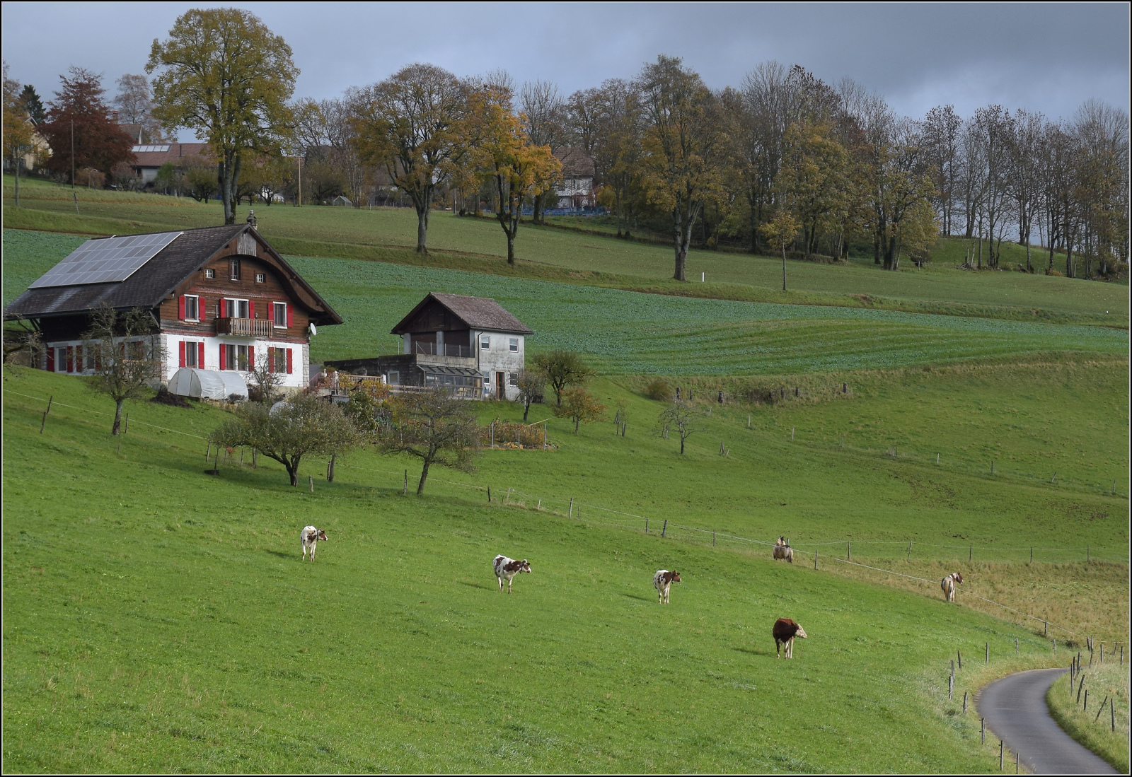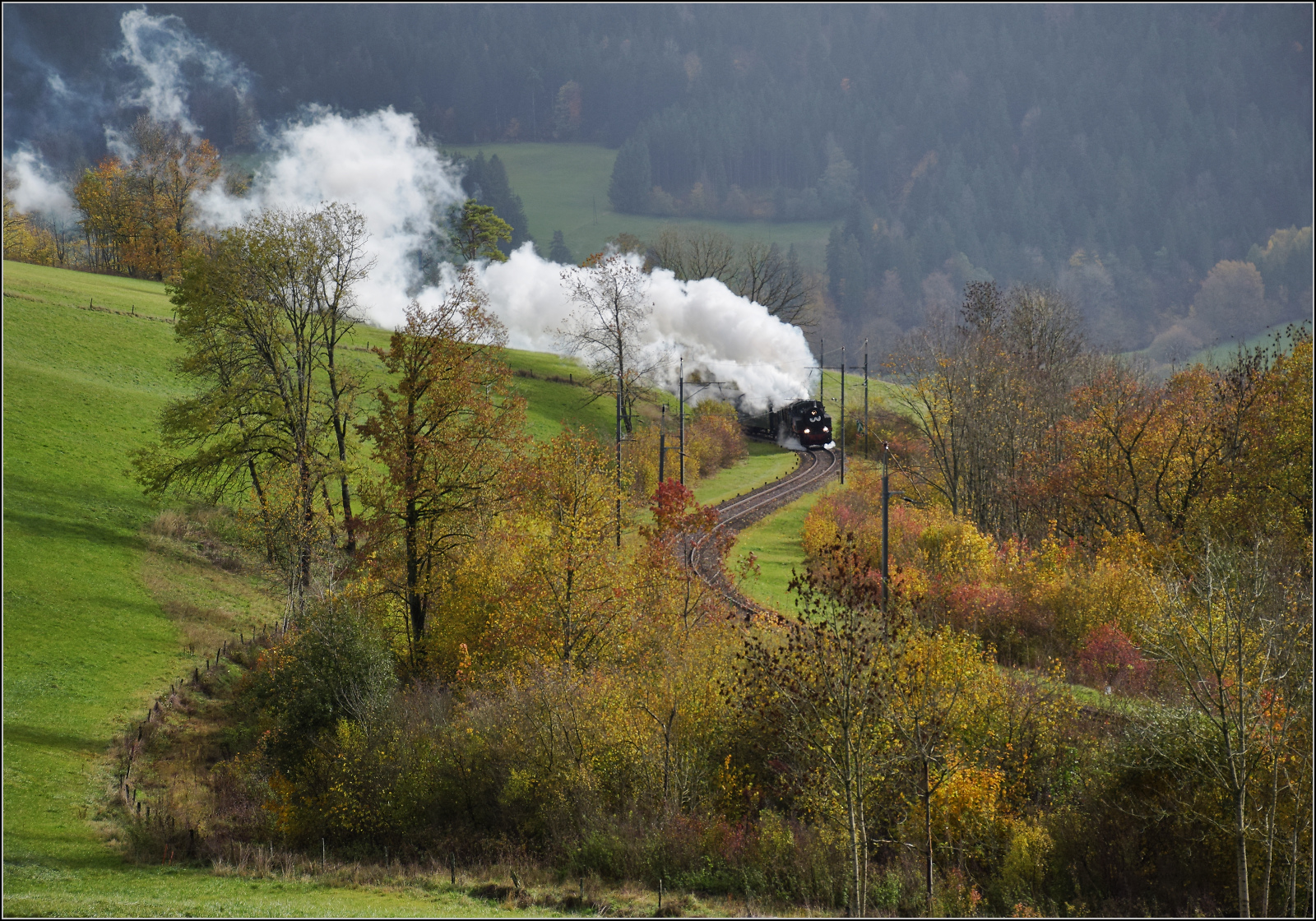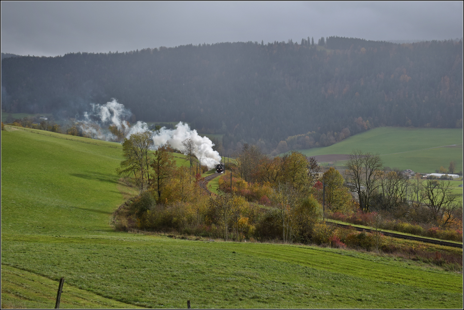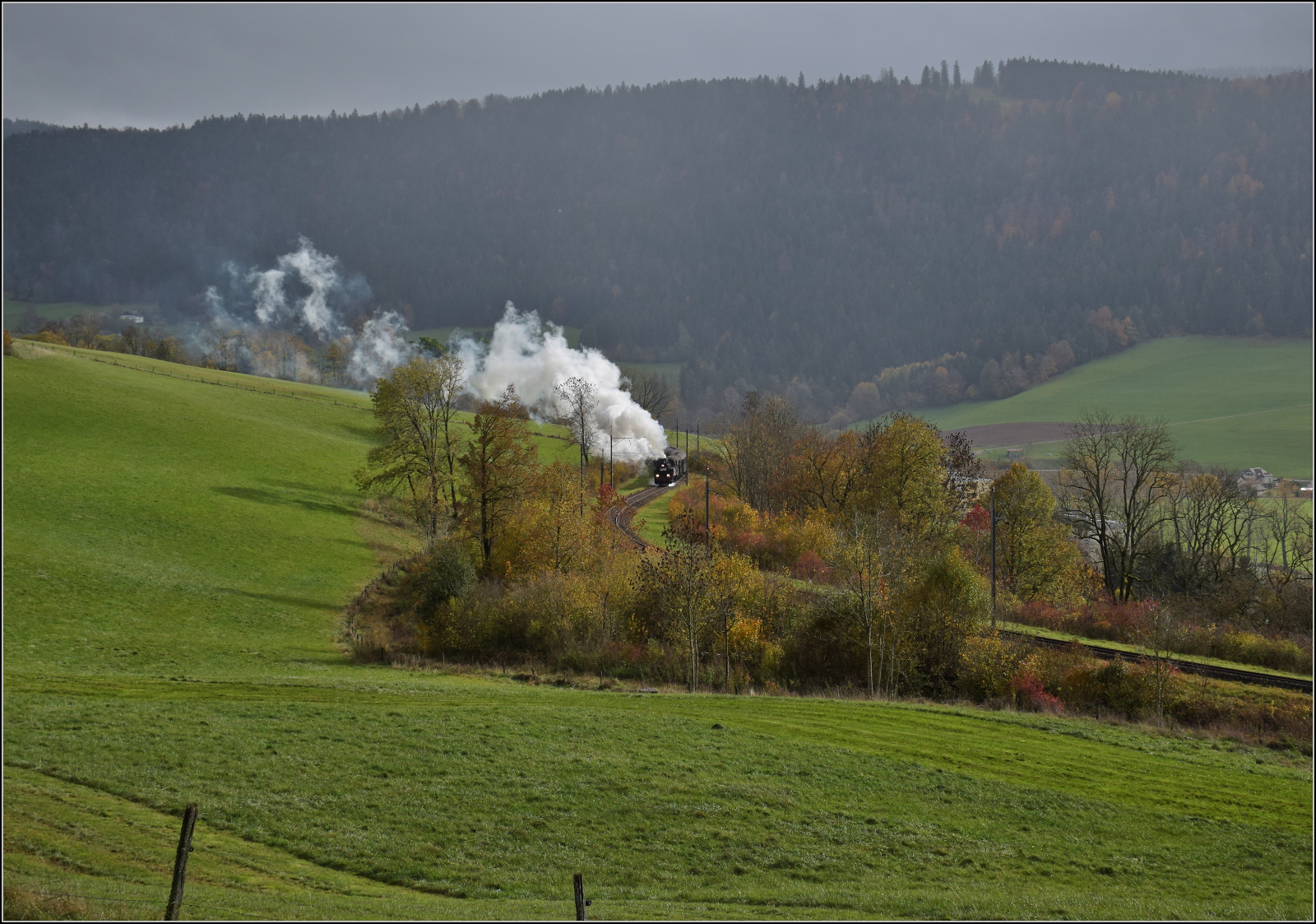 Das liebe Vieh ignoriert zwar den Flirt France, taugt aber als Vormelder einer Dampffahrt sehr wohl. Schon lange bevor der Dampfzug sichtbar ist, bestimmt Neugier die Weide. Auge-Belin bei Plancemont, Oktober 2025. km0