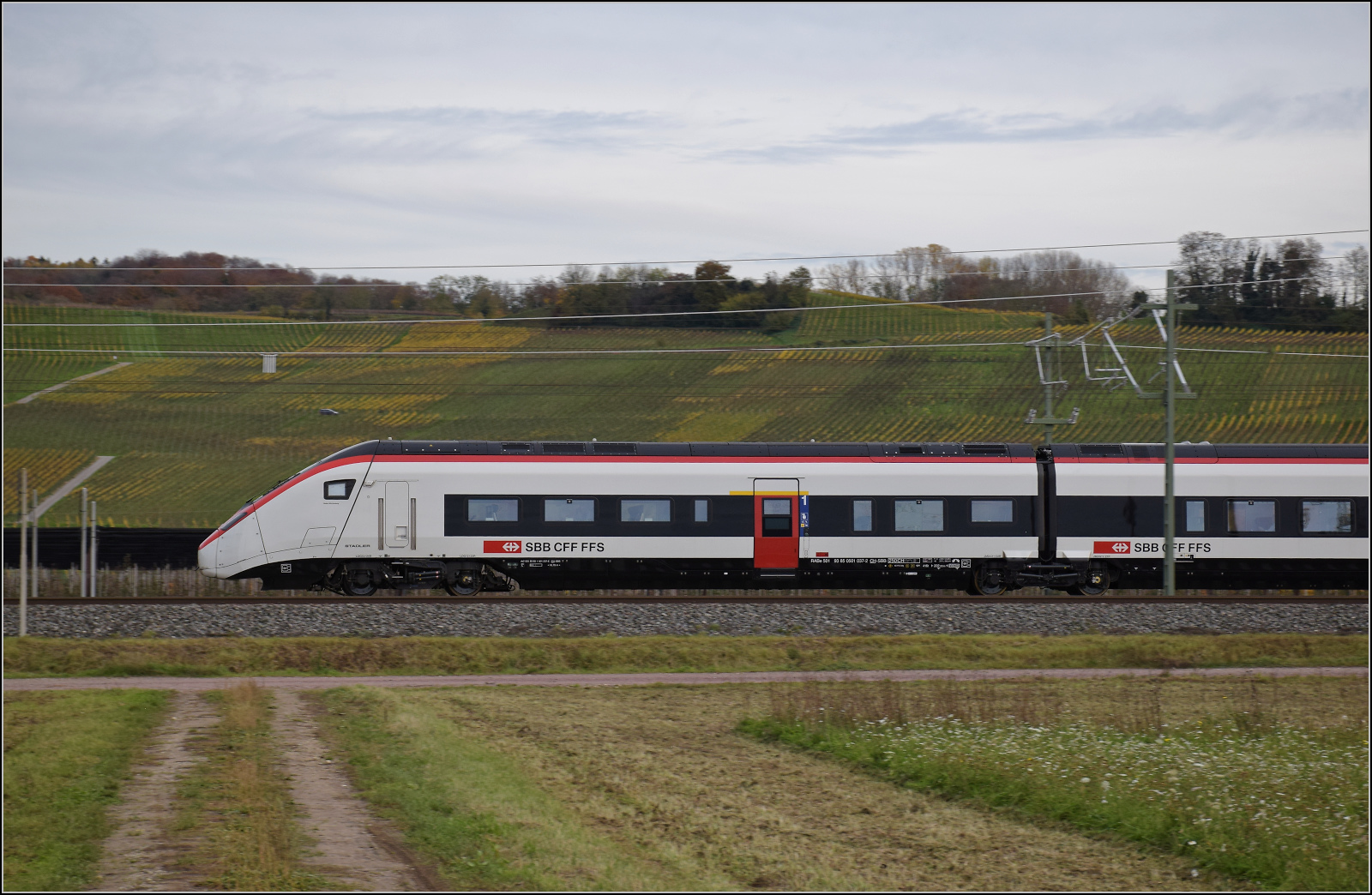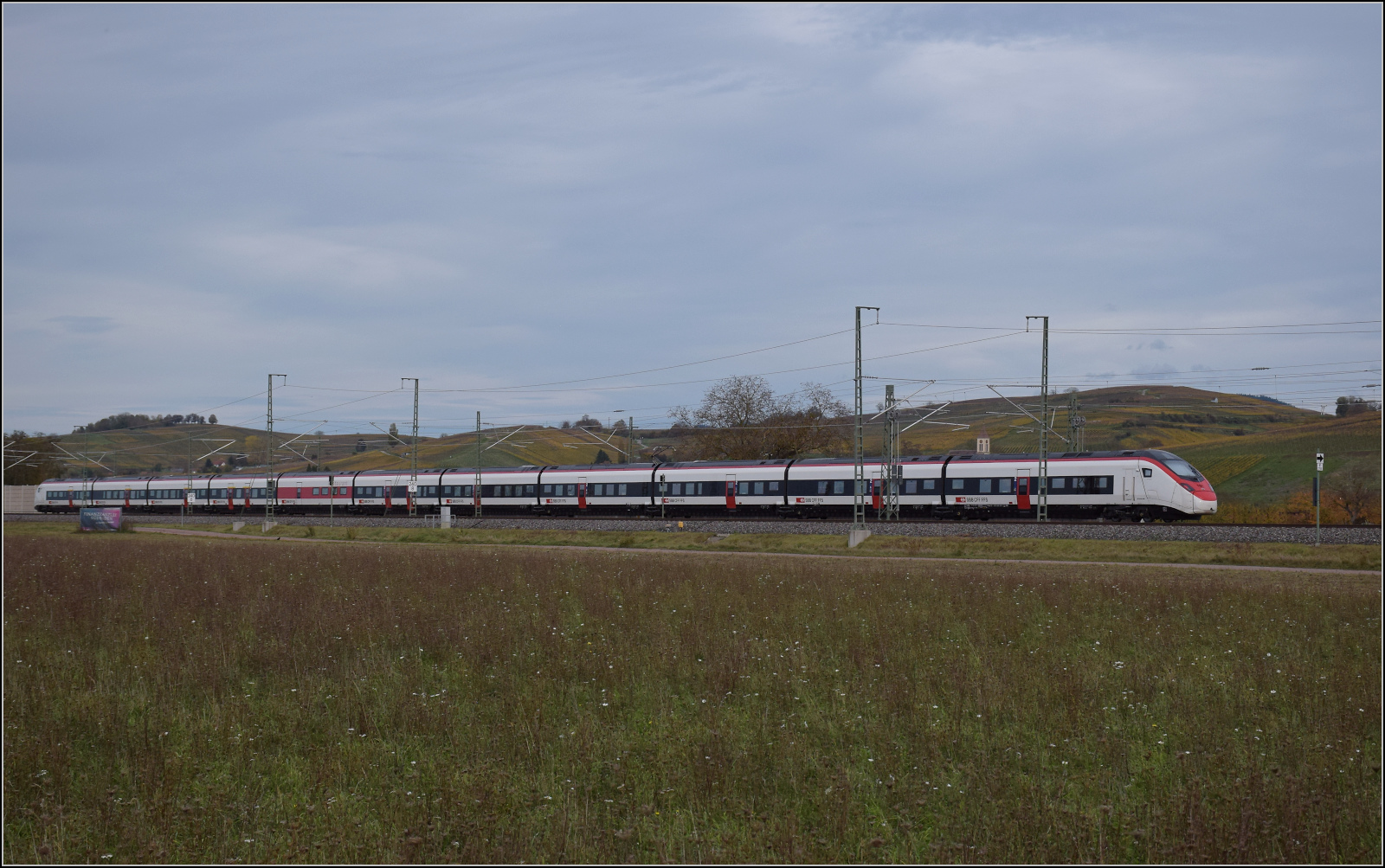 Herbst in Auggen. RABe 501 037 mit verschämt kleiner Aufschrift 'Baden-Württemberg' auf dem Weg nach Frankfurt. Unterdessen ist 193 524 'Limmat' ist südwärts unterwegs. Oktober 2025.