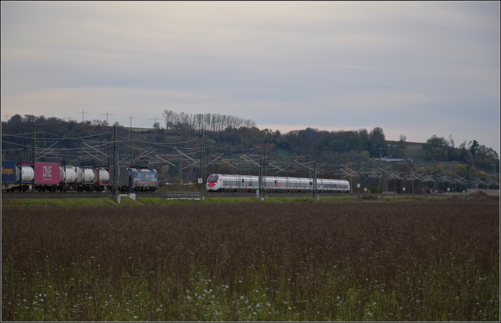 RABe 501 037 mit verschämt kleiner Aufschrift 'Baden-Württemberg' auf dem Weg nach Frankfurt. Unterdessen ist 193 524 'Limmat' ist südwärts unterwegs. Oktober 2025.