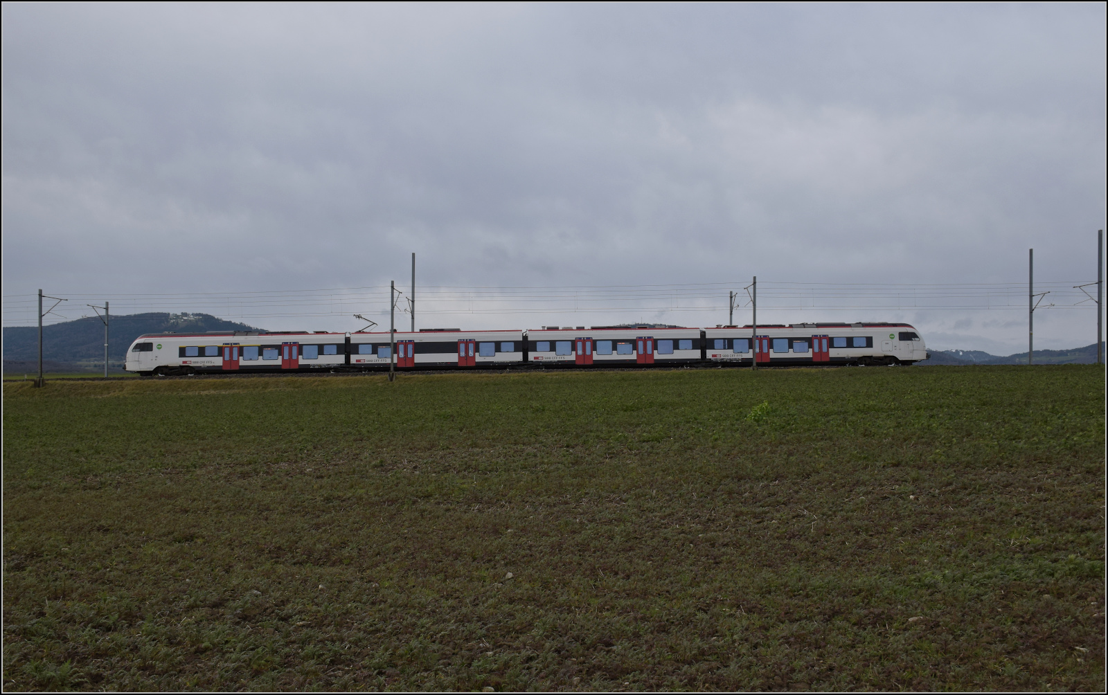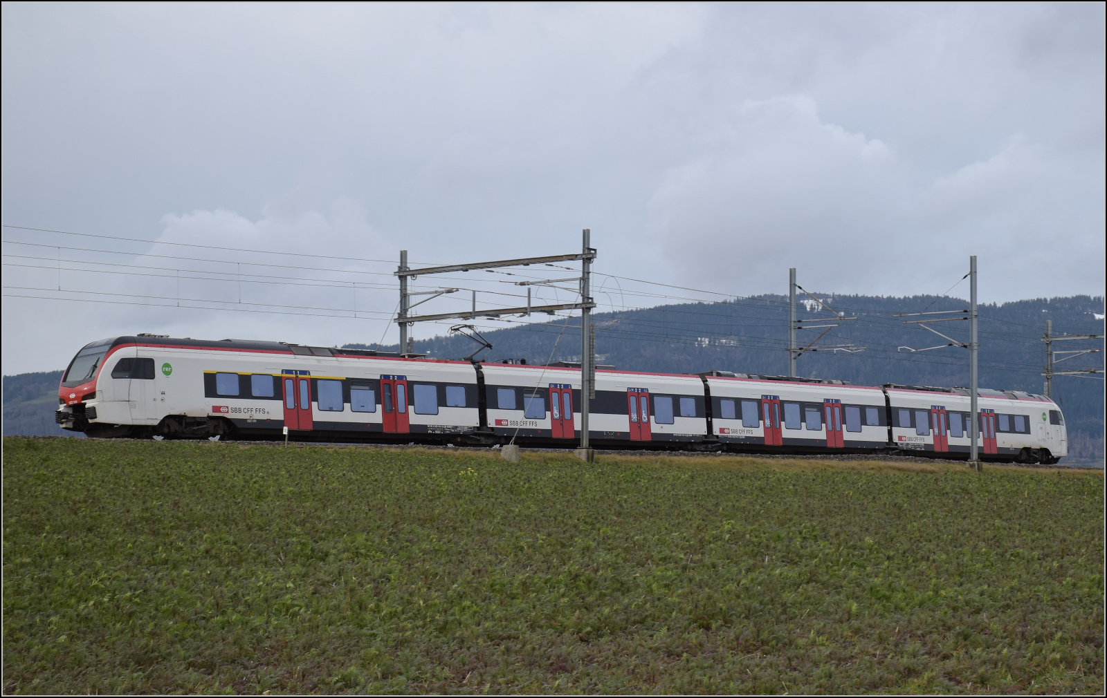 Flirt 3 RABe 523 101 'Le Day' bergwärts bei Arnex-sur-Orbe. Dezember 2025.