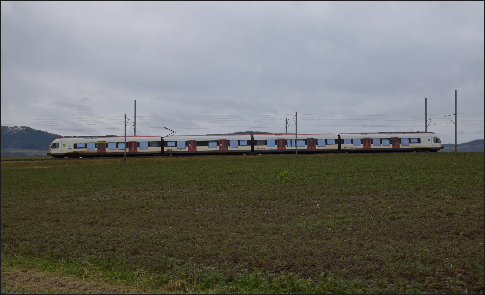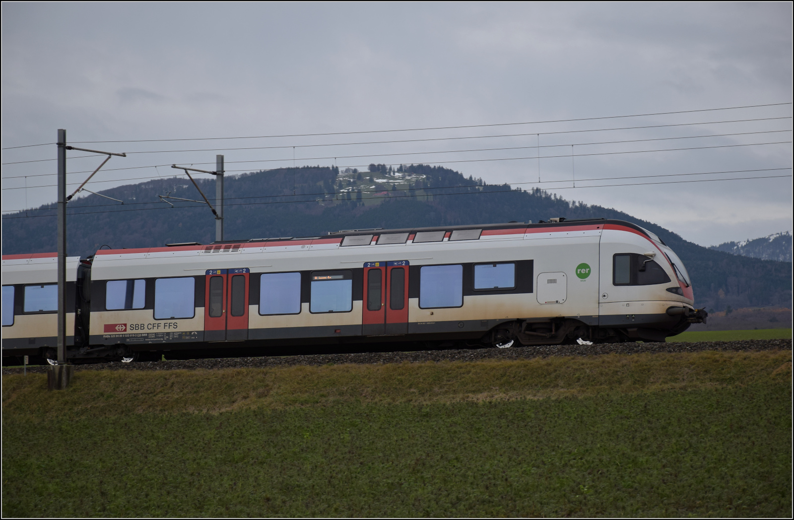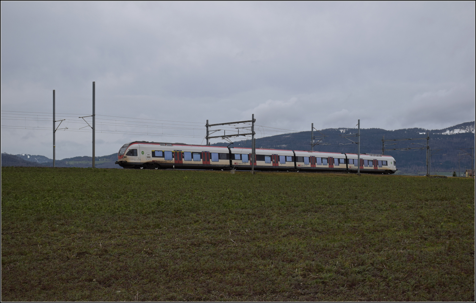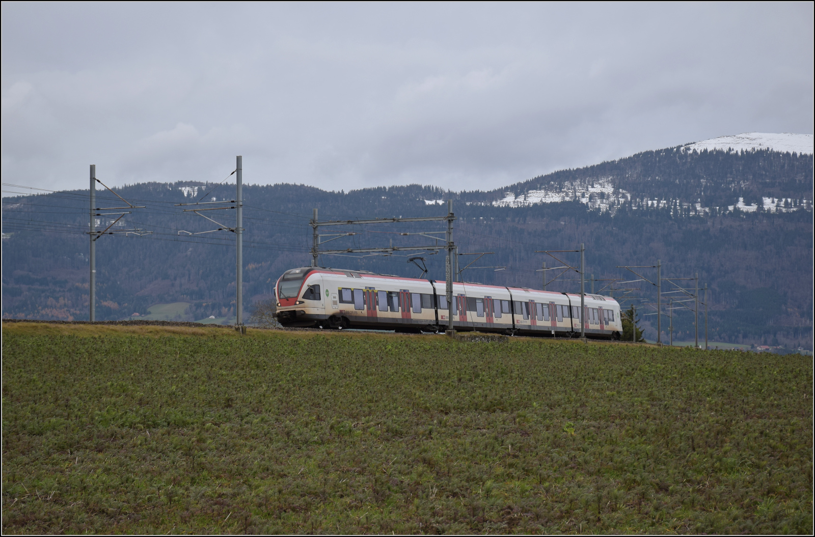 RABe 523 019 talwärts bei Arnex-sur-Orbe. Dezember 2025.
