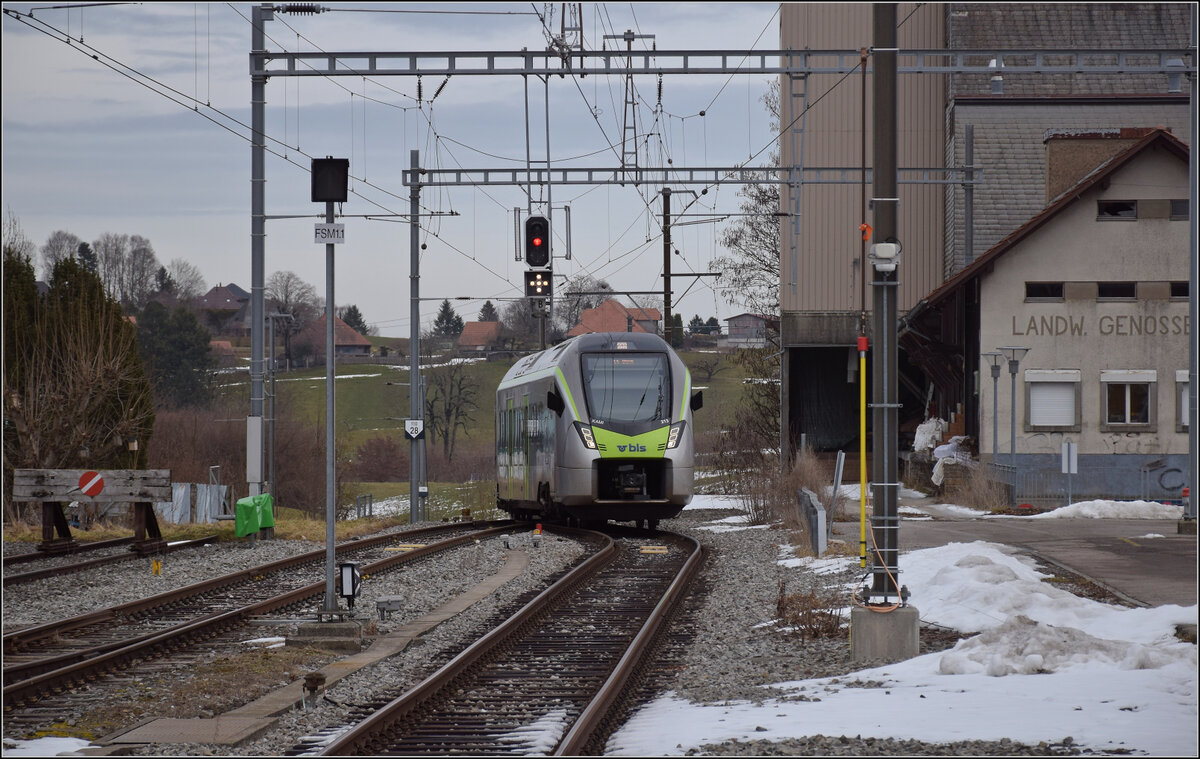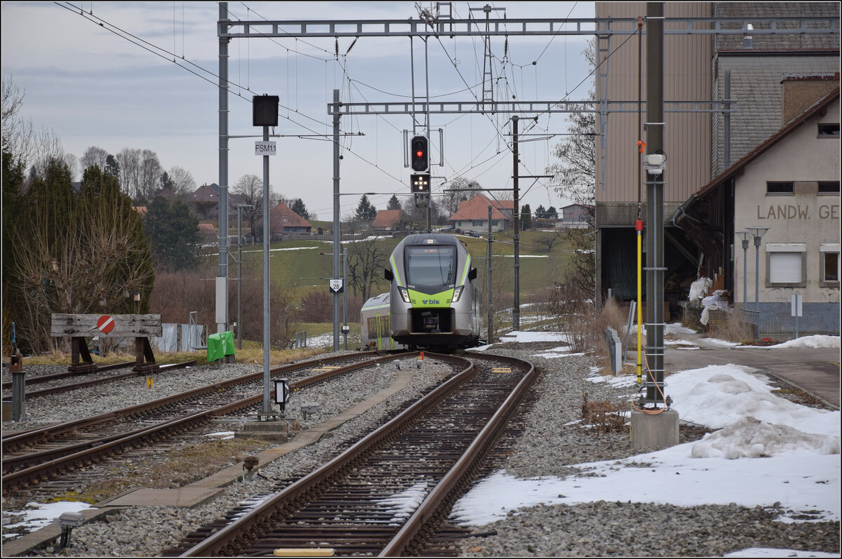 RABe 528 213 wartet in Schwarzenburg die Rückreise nach Bern ab. Januar 2026.