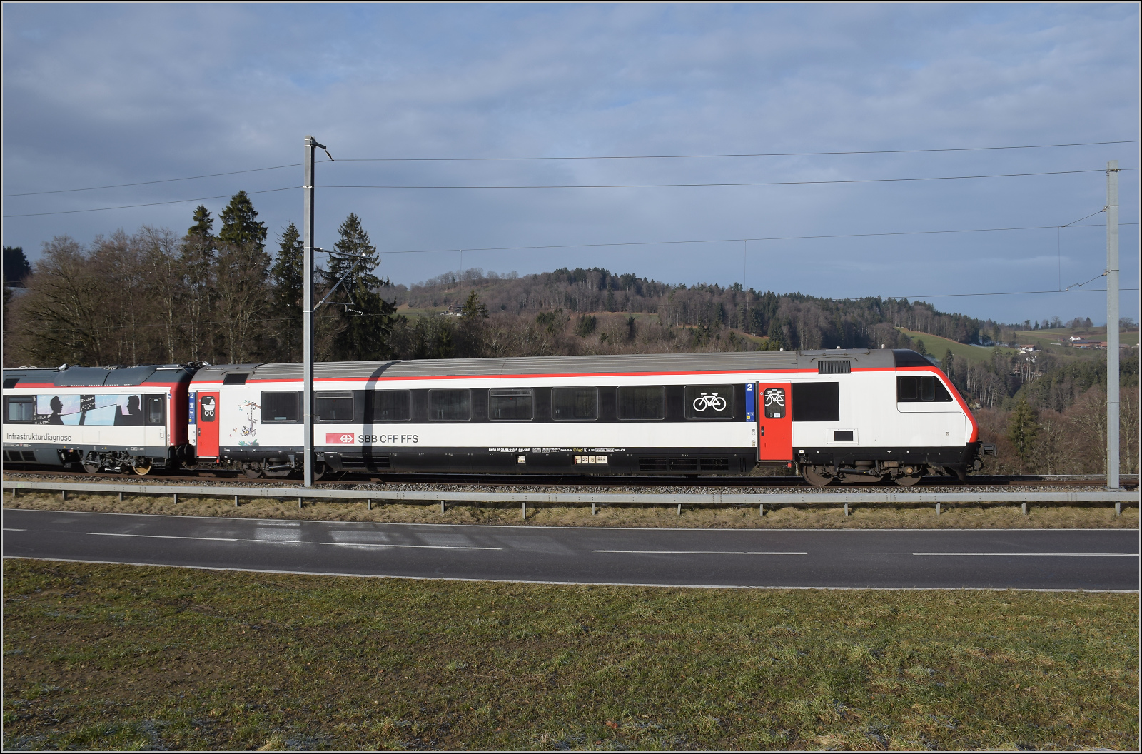 Messzug mit Re 460 014 'Val de Trient' auf dem Weg nach Bern. Im Bild der IC-Steuerwagen Bt 50 85 28-94 918-5 CH-SBB. Riedburg, Januar 2026.