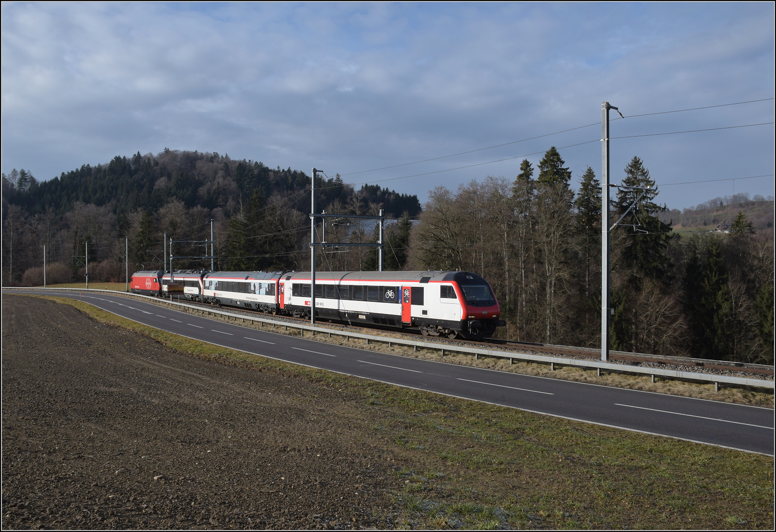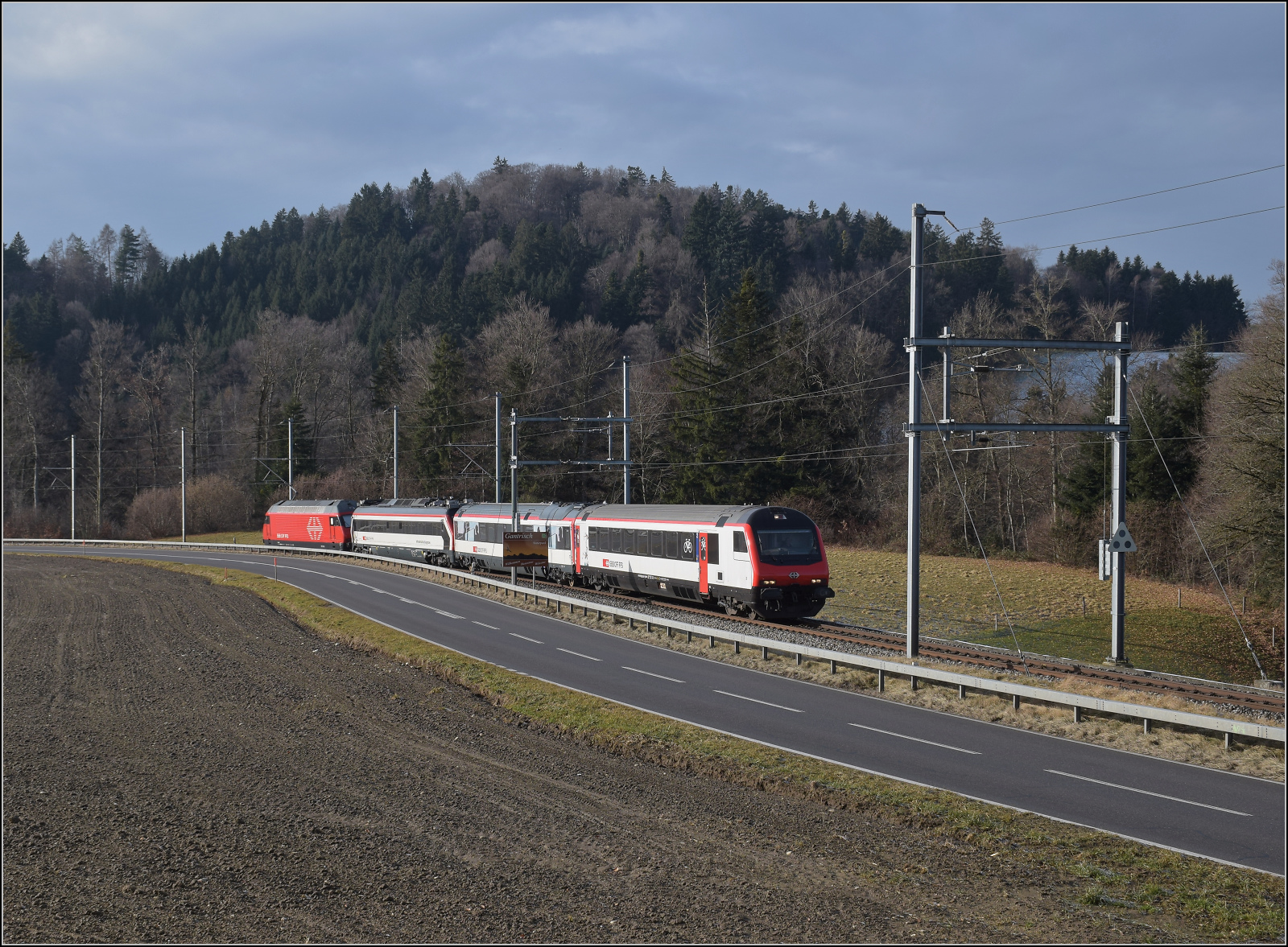 Messzug mit Re 460 014 'Val de Trient' auf dem Weg nach Bern. Riedburg, Januar 2026.