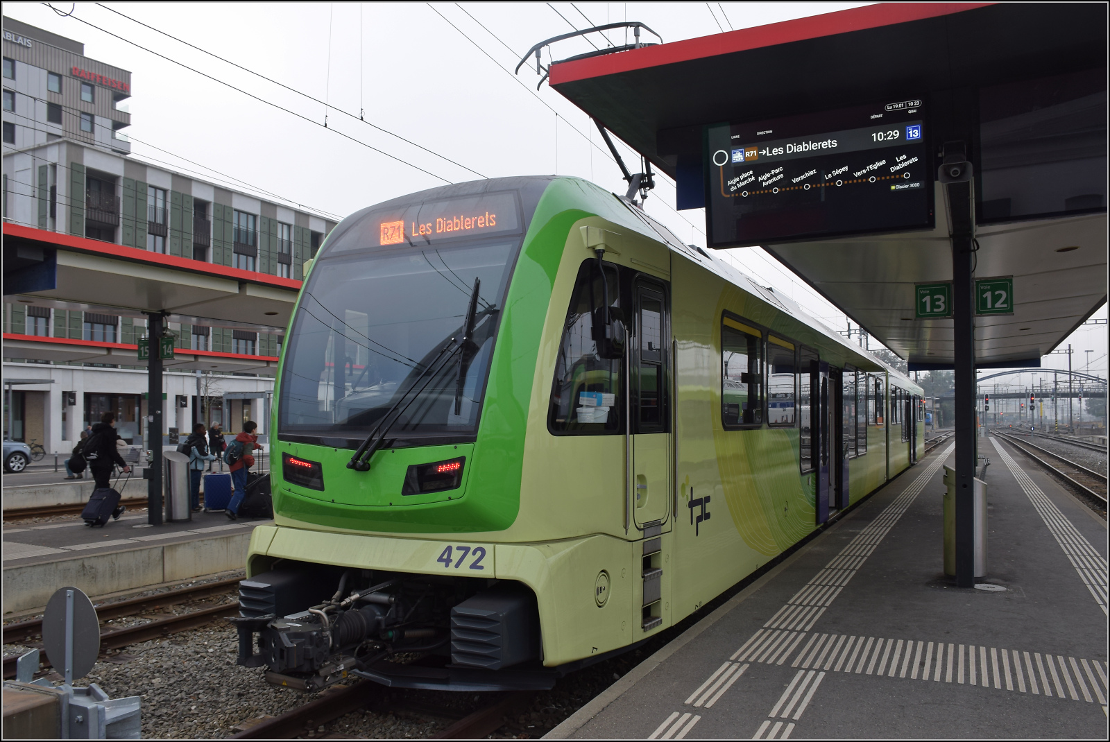 Be 4/8 472 wartet in Aigle auf die Abfahrt nach Les Diablerets. Januar 2026.