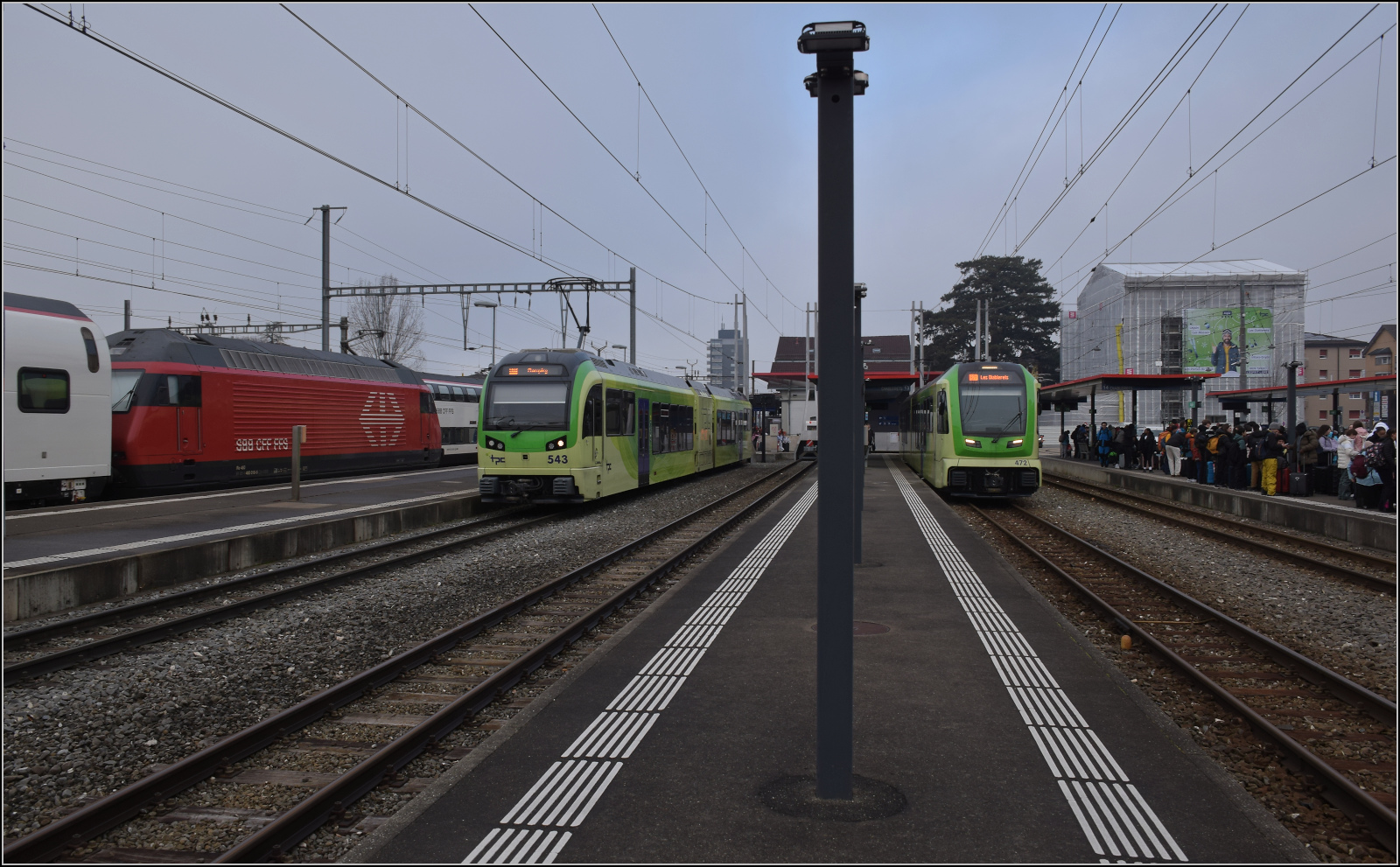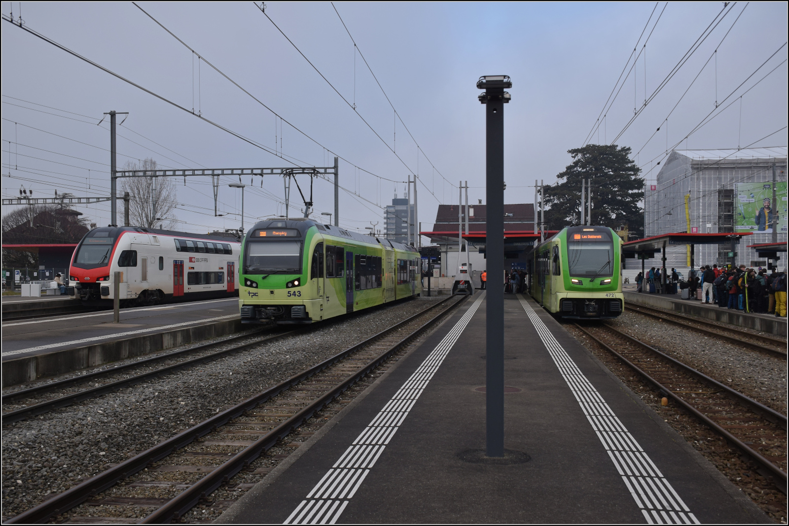 Beh 2/6 543 steht in Aigle für die Fahrt nach Champéry bereit, während rechts im Bild Be 4/8 472 in Aigle auf die Abfahrt nach Les Diablerets wartet. Auf den Normalspurgleisen fährt gerade ein IR nach Brig mit Re 460 018 ab. Januar 2026.