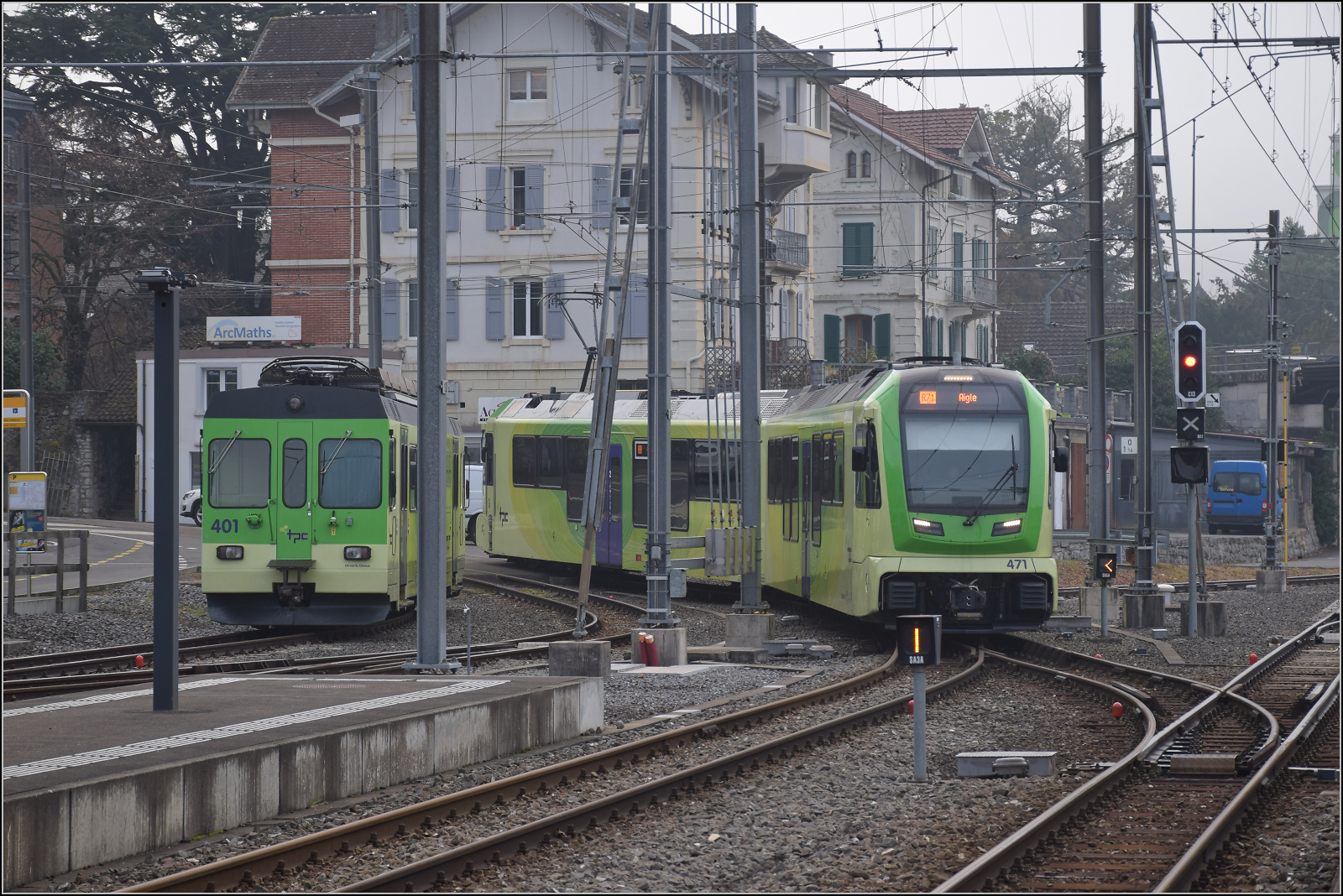 Aus Les Diablerets fährt Be 4/8 471 in Aigle ein. Links ist der Westschweizer Meterspurtriebwagen BDe 4/4 401 abgestellt, diese trugen die Hauptverkehrslast auf der ASD bis zur kürzlich erfolgten Ablösung durch die Be 4/8 aus einer Gemeinschaftsbestellung der Bahnen CJ, TransN und TPC. Januar 2026. km0