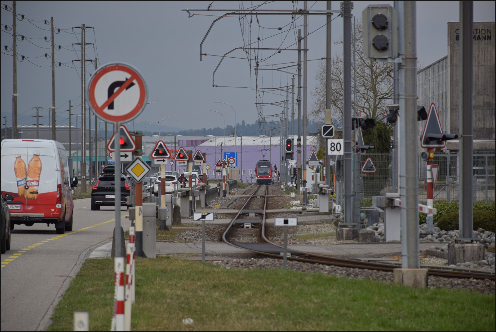 Bierlisi statt Bipperlisi. Be 4/8 111 'Jupiter' kommt von St. Urbahn nach Langenthal und fährt am Industriegebiet entlangt. Februar 2026.