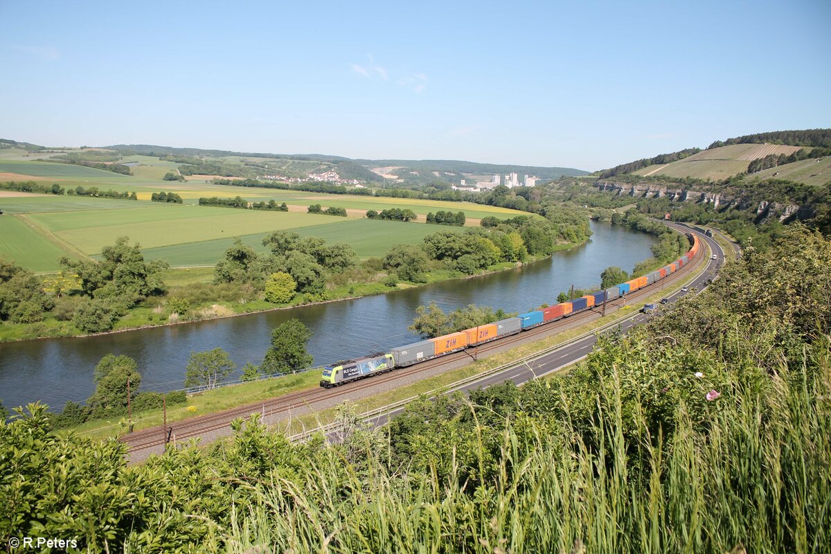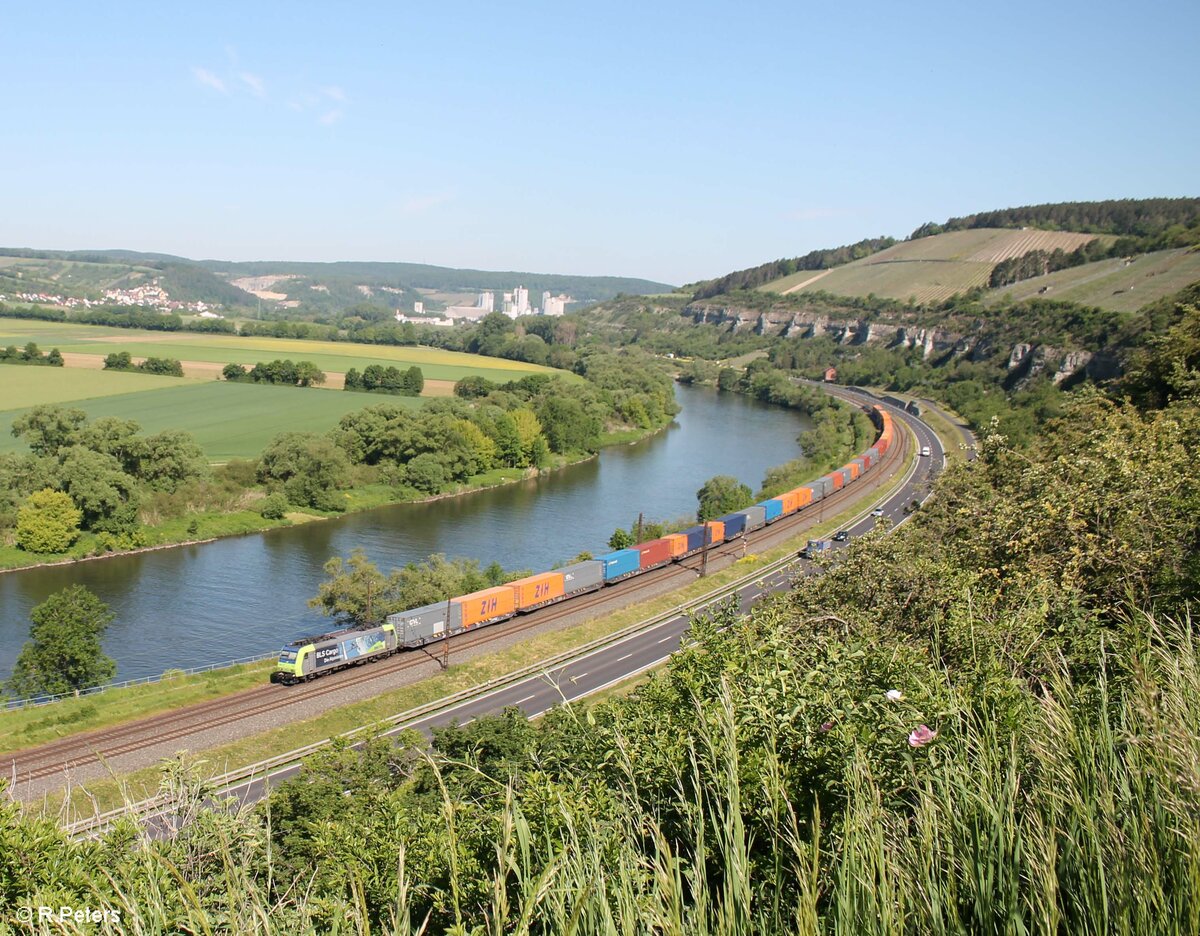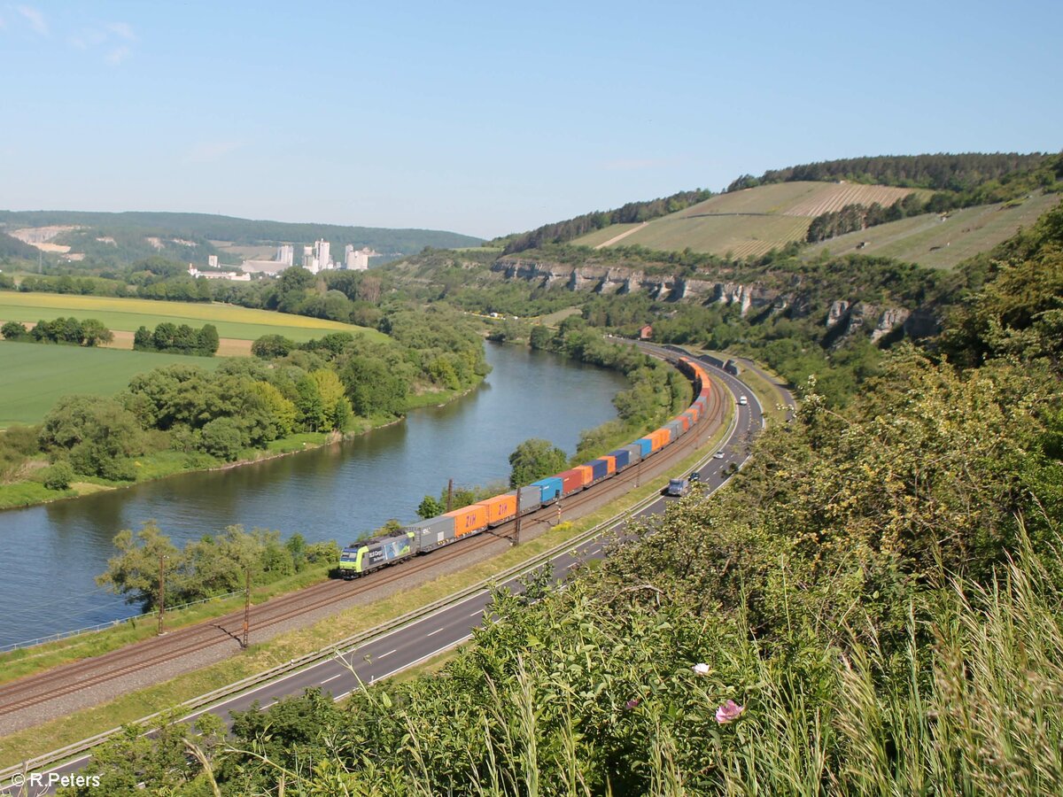 485 001-2 zieht zwischen Karlstadt und Himmelstadt einen Containerzug Richtung Süden. 02.06.21