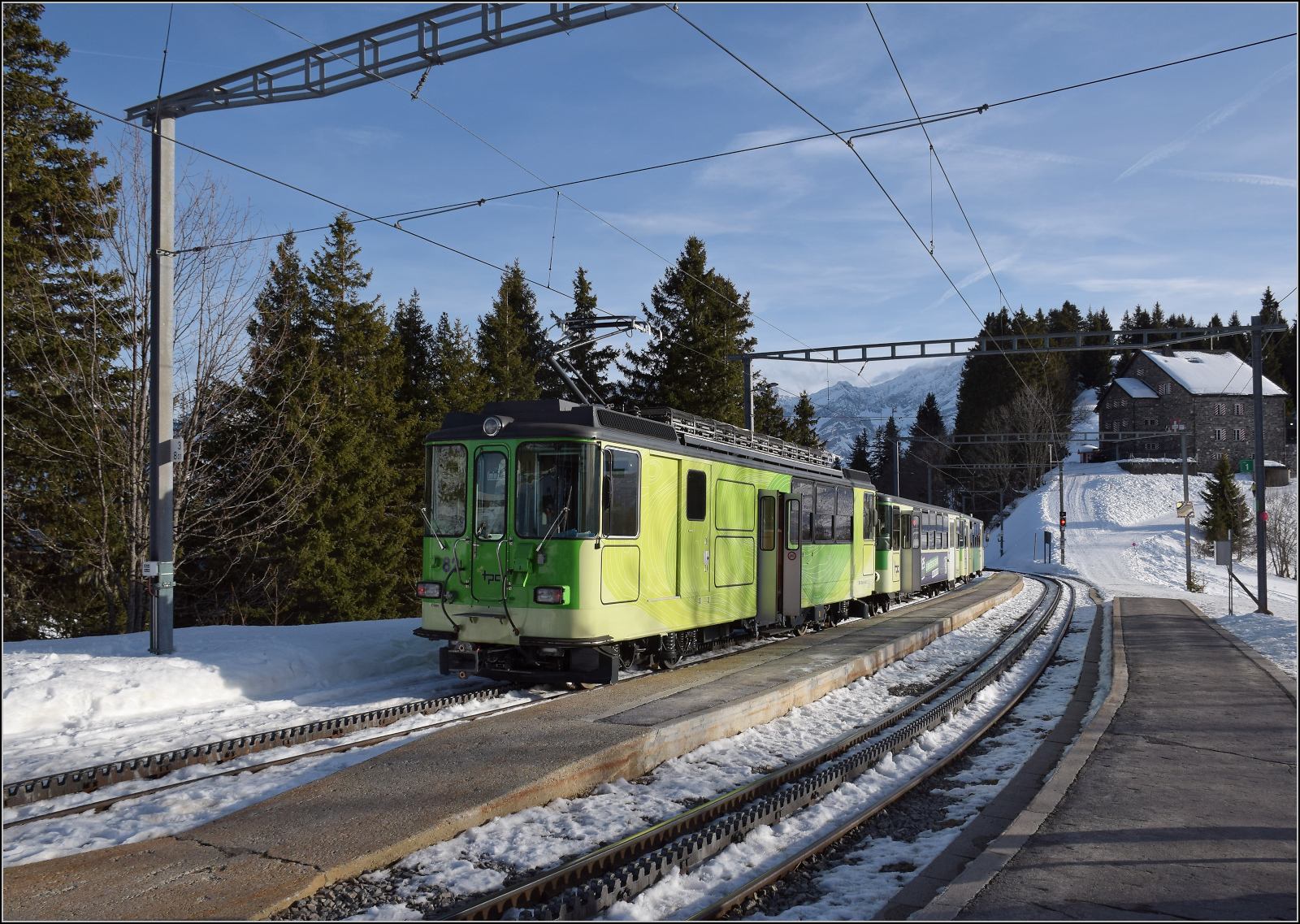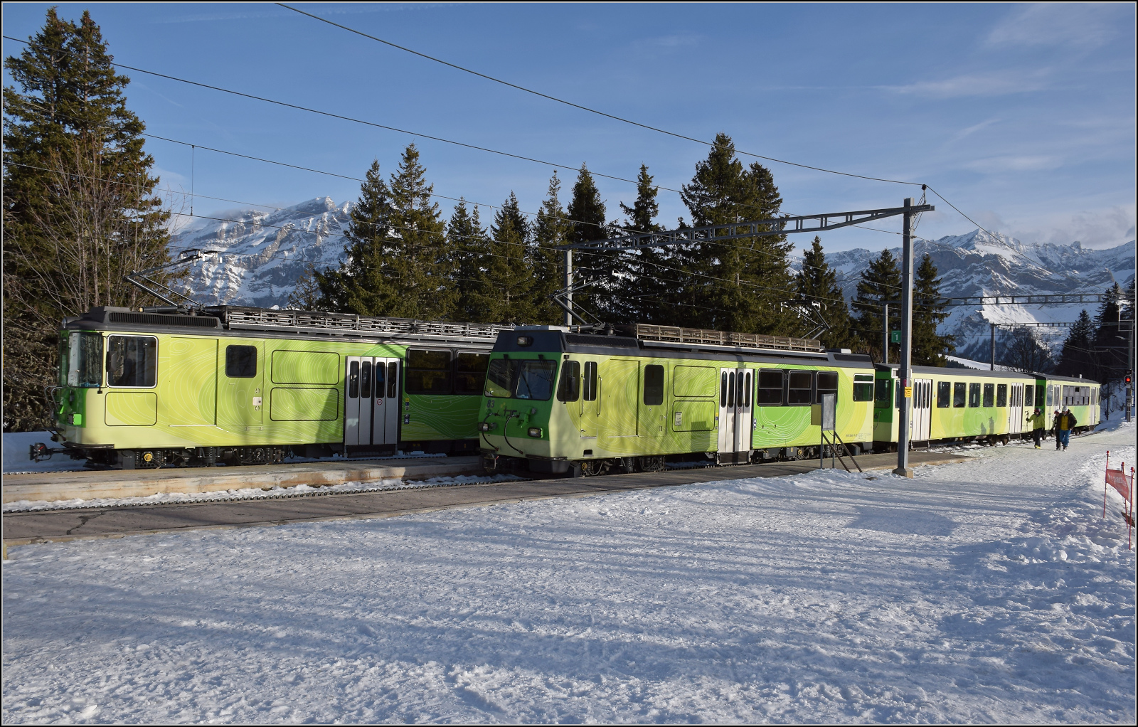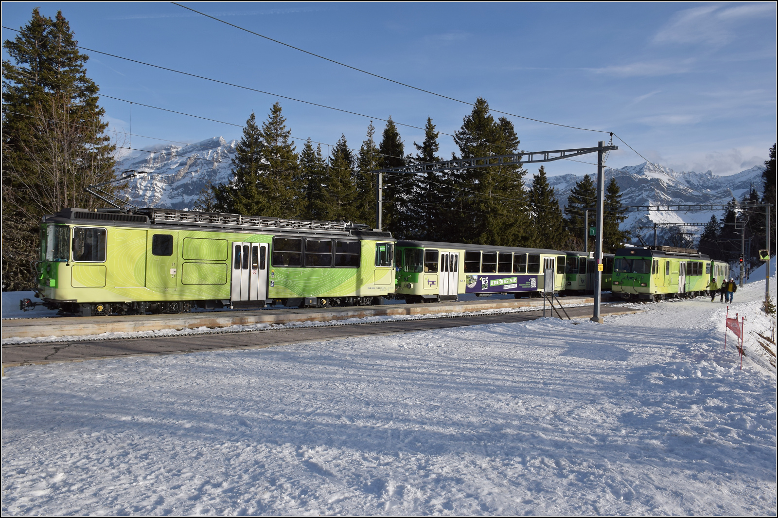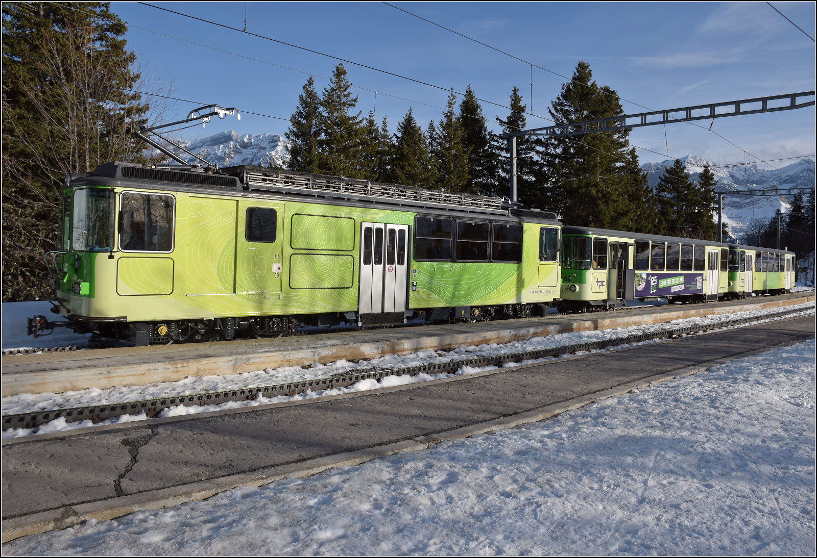 Der Triebwagen BDeh 4/4 82 wurde von SWP/SLM/SAAS im Jahr 1977 an die BVB geliefert und ist hier mit zwei (Ultraleicht-) Wagen talwärts unterwegs. Unterdessen kommt der neuere BDeh 4/4 83 den Berg hinauf. Dieser wurde 1987 von ACMV/SLM/BBC an die BVB geliefert. Bouquetins, Januar 2026. km0