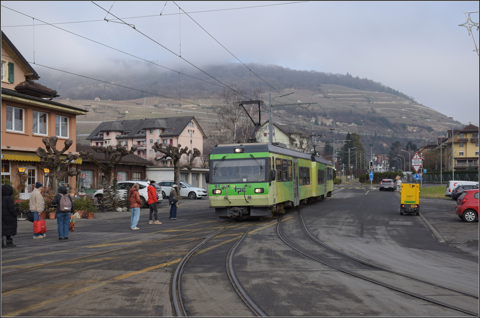 Beh 4/8 91 kommt im Bahnhof Bex an. Der Haltepunkt ist - wie früher oft - einfach das Strassenplanum. Januar 2026.