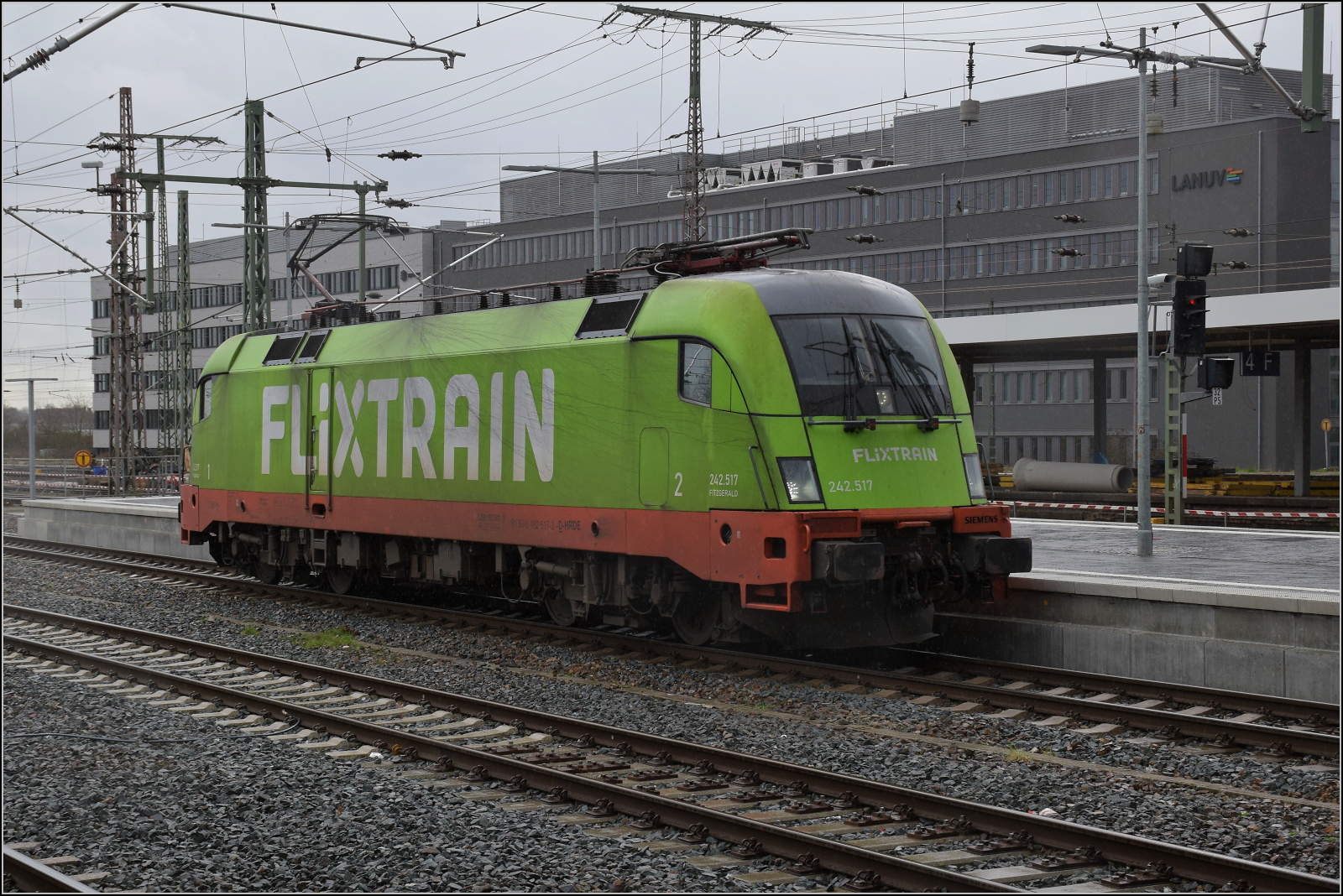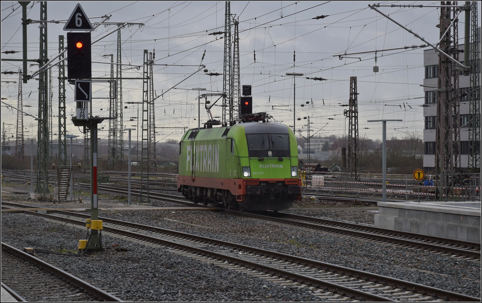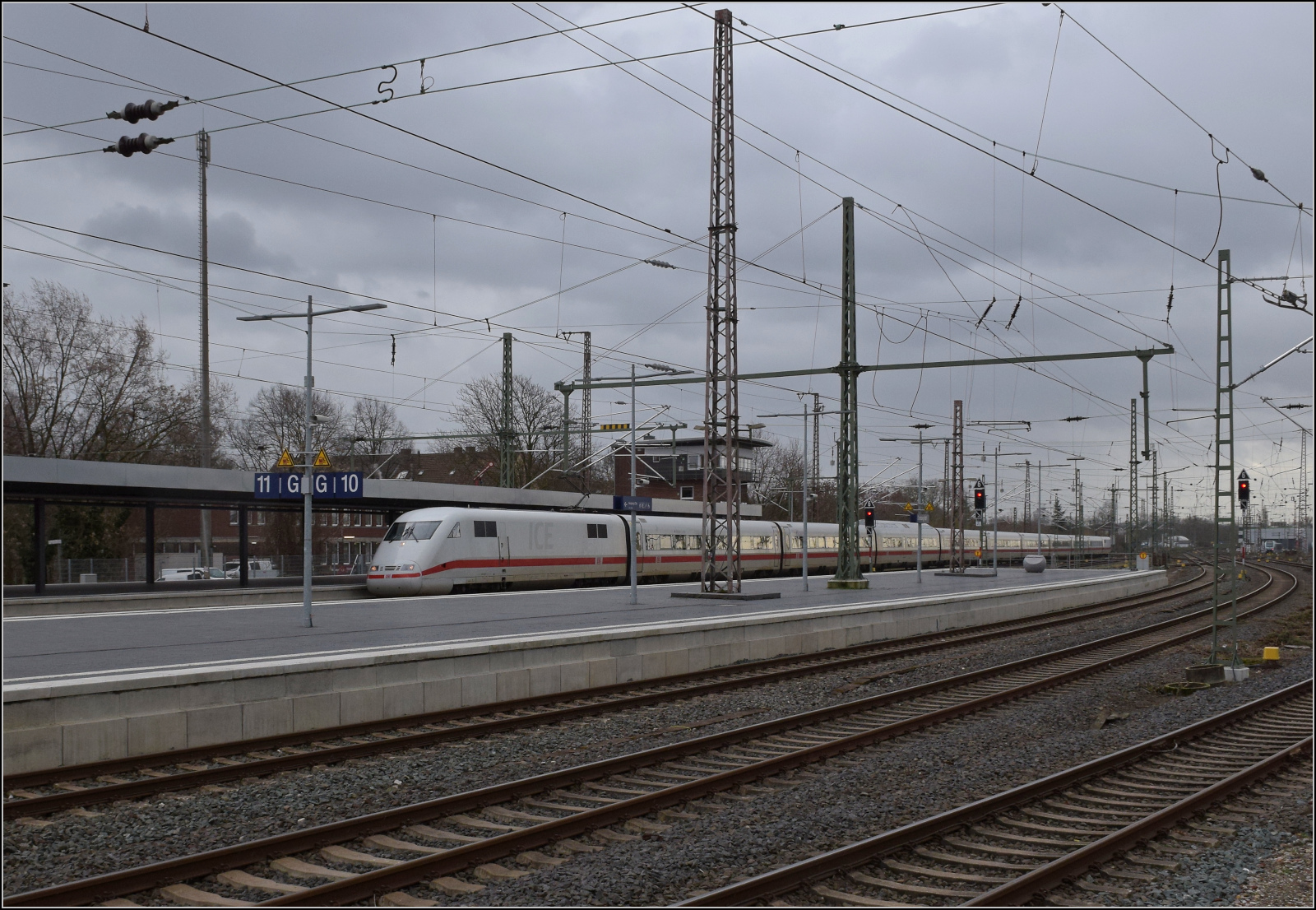 401 087 'Mühldorf am Inn' fährt für den Fotografen fast unerreichbar durch Duisburg. Februar 2026.